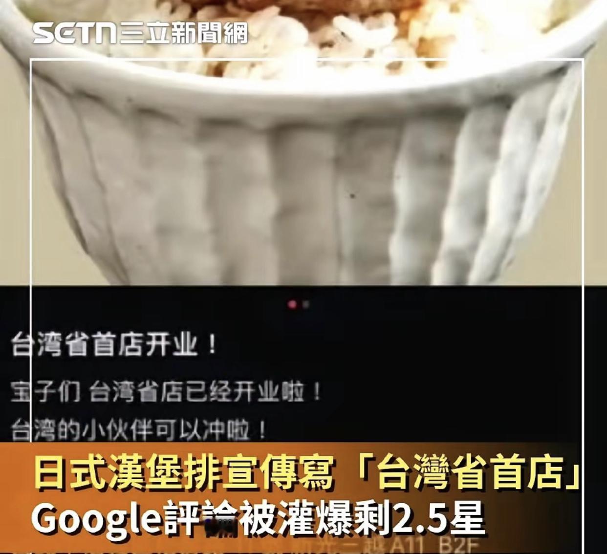 台媒:日式汉堡台湾首店开业,宣称标语为“台湾省首店”。 “宝子们,台湾省店已经开业啦!” “台湾的小伙伴可以冲啦!” 结果谷歌评价被台湾网军灌爆,只剩2.5星。