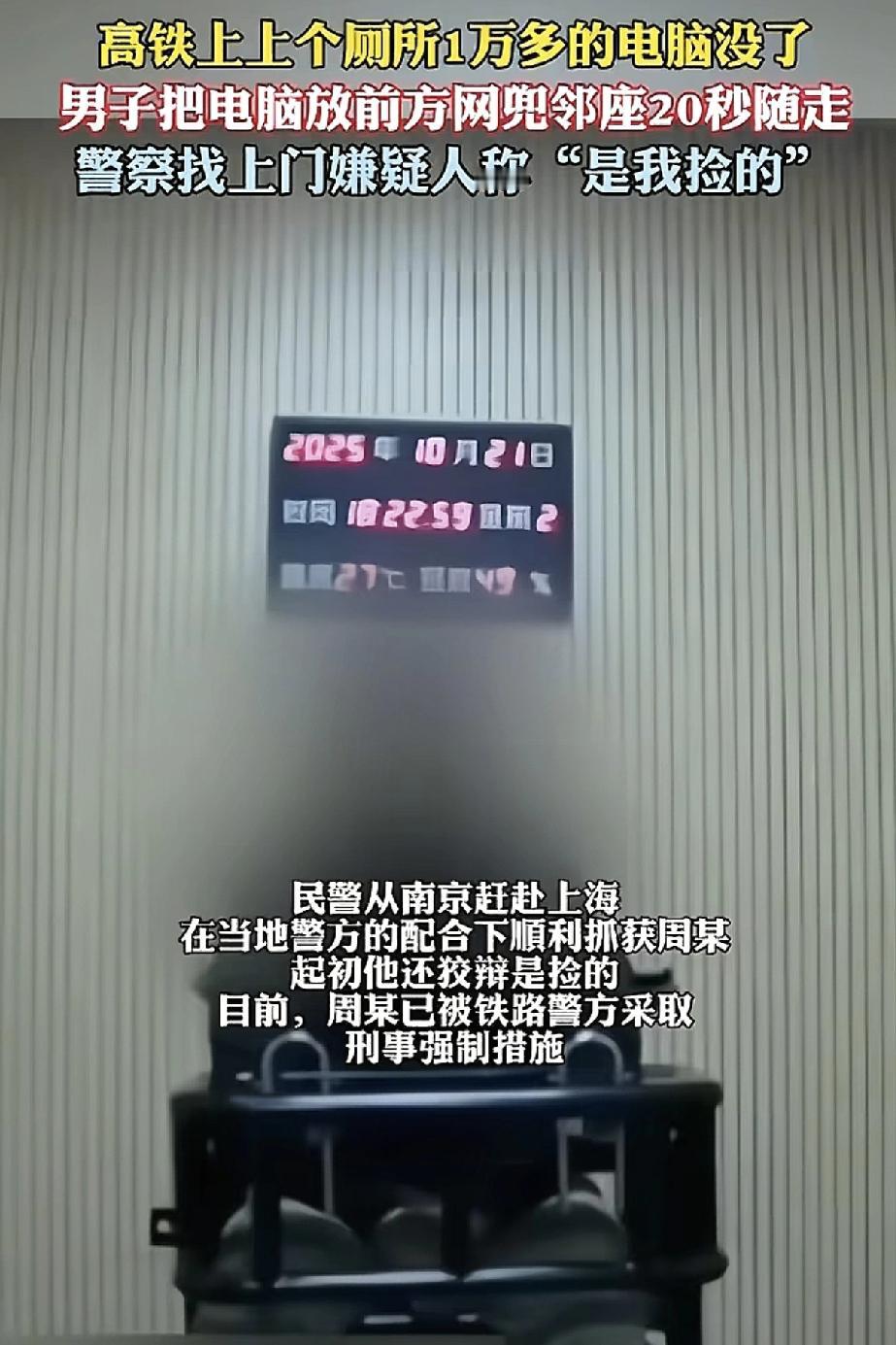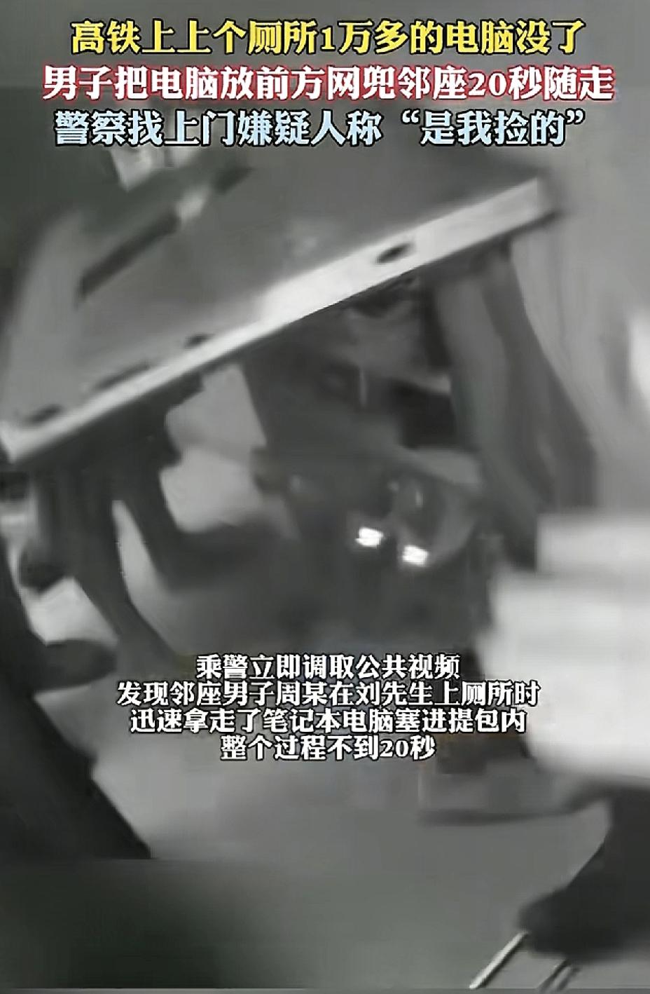 不得不说,这小偷的胆子也是忒大了。人家只是上了一个厕所功夫,就把人家一万多的电脑揣兜里顺走,还是在高铁上,真是“刑”啊。 但是这小偷是不是有点太自作聪明了,以为还是在往年的绿皮火车上啊,偷完没人发现[笑哭]。现在高铁票都是实名制的,每节车厢上都有高清摄像头的,人家一调监控就能查出来了,就算长了翅膀怕是也飞不走吧。 看来这个小偷是个新手啊,老手应该不会傻傻的在高铁上偷吧。小偷 盗窃