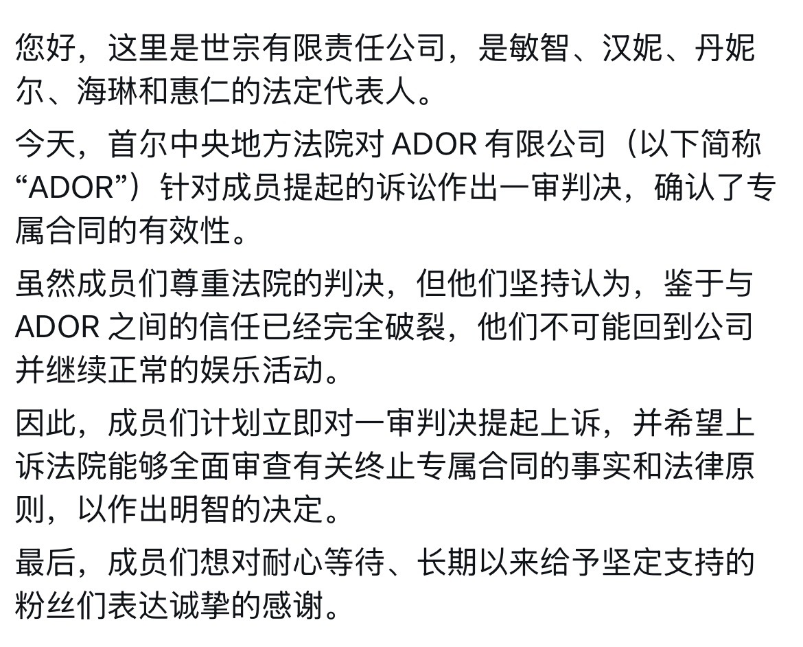 虽然成员们尊重法院的判决,但他们坚持认为,鉴于与 ADOR 之间的信任已经完全破裂,他们不可能回到公司并继续正常的娱乐活动。