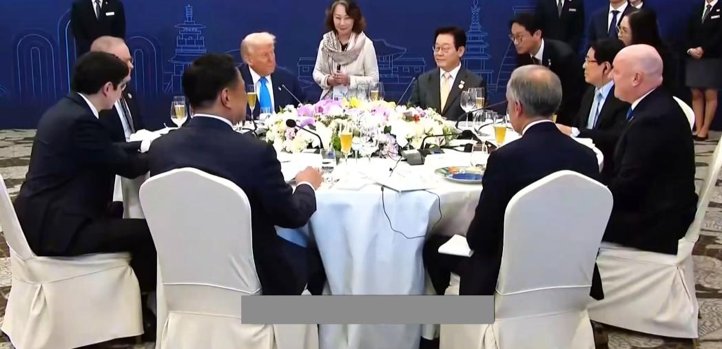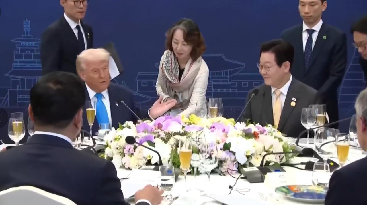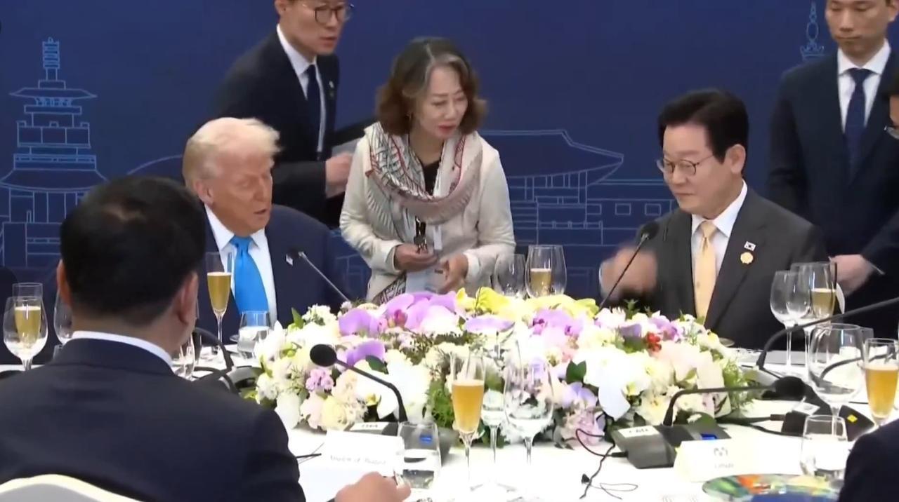 这位站在李在明与美总统之间的女翻译,太优雅了吧!10月29日APEC峰会晚宴上,