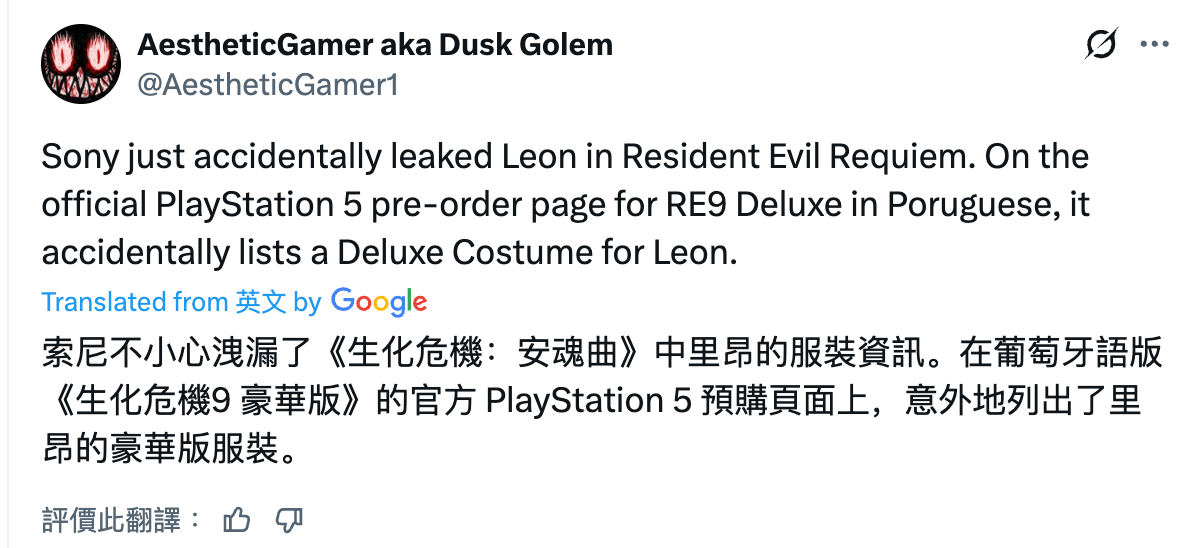 据游戏推主AestheticGamer援引自Dusk Golem的消息,索尼不小心泄露了《生化危机:安魂曲》里昂的消息。在葡萄牙语的《生化危机:安魂曲 豪华版》PS5商店页面当中,列出了里昂的豪华版服装的条目。 ​​​