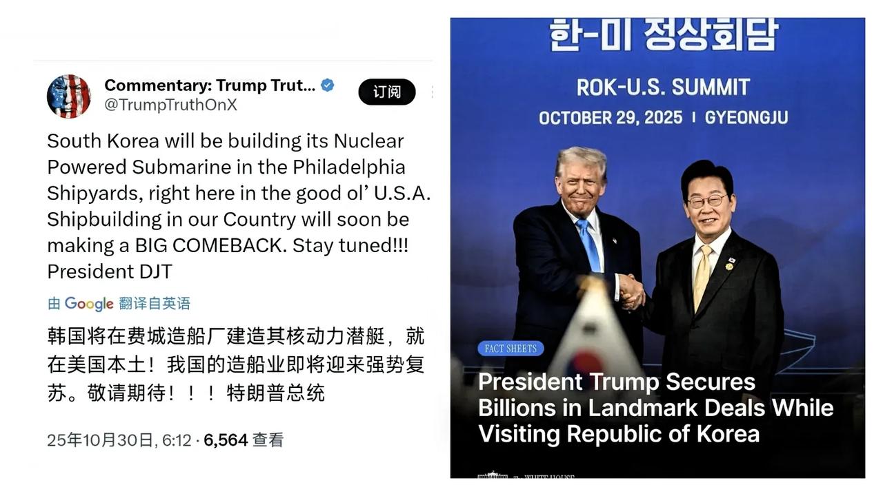 美国总统特朗普 今天(10月30日)早上发文写道:“韩国已同意向美国支付3500亿美元,以换取美国降低对韩国征收的关税。 此外,他们还同意大量购买我国的石油和天然气,韩国富裕企业和商人对我国的投资将超过6000亿美元。 我们的军事联盟比以往任何时候都更加牢固,基于此,我已批准他们建造核动力潜艇,以取代他们目前使用的老式且远不如核动力潜艇灵活的柴油动力潜艇。这是一次非常棒的访问,与一位伟大的总理同行!” 特朗普这波发文简直把“自吹自擂”玩出了新高度,可惜满篇都是经不起推敲的空话! 张口就说韩国掏3500亿美元、投资超6000亿,还批准人家建核潜艇,连李在明是总统都能说成总理,这记性也是没谁了。 且不说韩方早就明说拿不出这么多现金,3500亿相当于韩国外储的80%,硬掏可能引发金融危机。 就说核潜艇,韩国连核心反应堆技术都没有,美国自己也没打算真帮忙,所谓“批准”不过是画饼。 本质上这就是场不对等的政治交易,特朗普靠霸权逼韩国画大饼,给自己脸上贴金,韩国却被架在火上烤。 所谓的“牢固联盟”,不过是强者对弱者的压榨罢了。