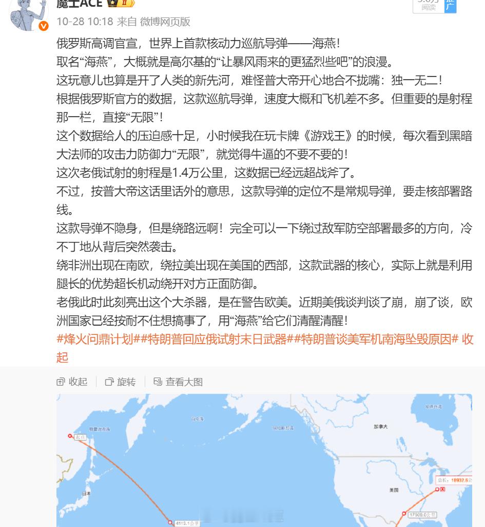 近期欧洲那边是真的作死了,爱举白旗法兰西,预备派2000人的外籍军团去乌克兰帮填线。这种准备正式参战的行为,俄罗斯预感到俄欧战争的爆发可能性,不得不亮出两款力大飞砖的粗狂核动力武器,震慑一下春心浮动的欧罗巴。