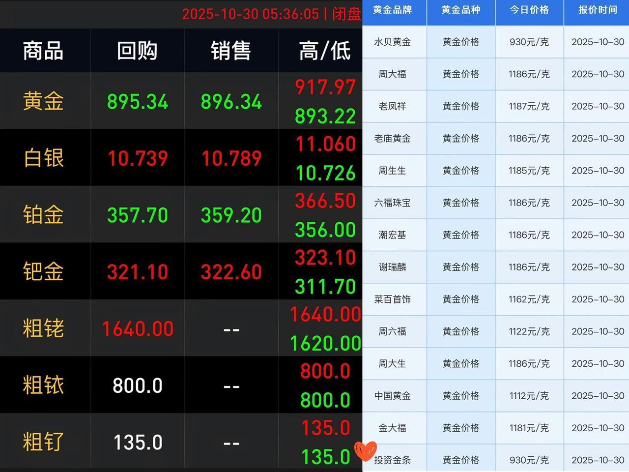 2025年10月30日早上 ​​​​​​​​​来看看金价,今天比前几天降了一些,前段时间金价一直飙升,最高的时候回收价都有1040人民币一克,今天成了回收价895。 短短十天,落差这么大,好多人都心动想卖金了,我忍住了。一来这金饰是结婚用的,当时就图个场面,没多少分量;二来要是卖了,万一金价又涨,不得悔青肠子?涨了又想追加,还怕赚少,整个人神经兮兮,心情都受影响。 我觉得,本来就搞金融或者兜里有闲钱的人,投资黄金可能没啥压力。可像咱普通打工人,真别轻易把钱砸进去。大家觉得呢?金价行情 金价