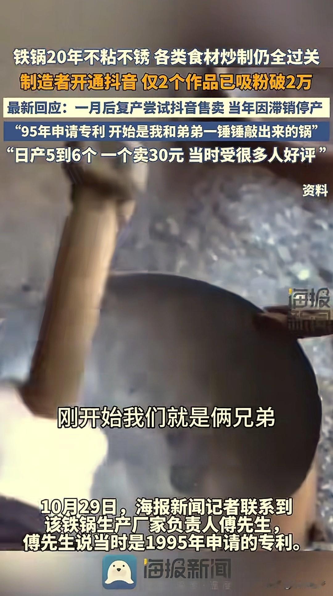“一锅传两代。”浙江温州,一女子家中有一口用了30年的铁炒锅,锅底有些用薄了,本打算复购一只,结果转遍了整条街都没找到同款。女子不甘心,把视频发到了网上,却意外得知工厂早就停产了,正要放弃时,发生了戏剧性的一幕:当年的老板恰巧看到了她的视频。 女子也没想到,当年花30块钱买的一口铁锅,竟然用了30年,这种性价比高的铁锅直戳到网友心坎里。 根据海报新闻10月29日报道,女子家里这口铁锅当初是婆婆买的,用了20年后,她又用了10年,整整用了两代人,之所以想复购,是因为铁锅不上锈,更不会粘锅,也没有任何涂层科技,价格也公道。 视频发出,本来女子听说停产后,几乎不报希望,没想到,短短几天,当初的厂家居然主动联系到了她,并表示,虽然停产了,但是看到她这样的回头客,和网友们的呼声,打算一个月后重新 生产,这个消息一下子让女子又惊又喜,同时老板还揭秘了当初停产原因。 原来,老板在1995年12月份开始售卖铁锅,当初只有他和弟弟两个人,纯手工敲出来的铁锅,一天也只能做五六个,后来买的人不多,也慢慢停产了。 他完全没想到过去这么久了,居然还有回头客。更让人意想不到的是,网友们竟然纷纷开始“预定”了。 有网友迫不及待道:不是销路不好,而是你的质量太好了,良心商家早晚都要火,赶快复工吧,我也想买两个,现在想要买个好锅真的很难! 也有网友说:这女子真的是贵人呀!30年过去了,泼天富贵来了,就看这老板能不能接住! 不得不说,老一辈的匠人精神就体现在实在好用上,没有那些科技狠活,也没有五花八门的营销,靠的就是手艺人的真本事和用料。 当年老板和弟弟一锤一锤地敲,虽然成品少,都是辛苦钱,但是图的是个问心无愧。所以,这口锅能“火”起来,一点也不意外。 大家支持的不仅是一口锅,更是对手艺人的信任,也希望老板赶紧行动起来,接住这次展示的机会。