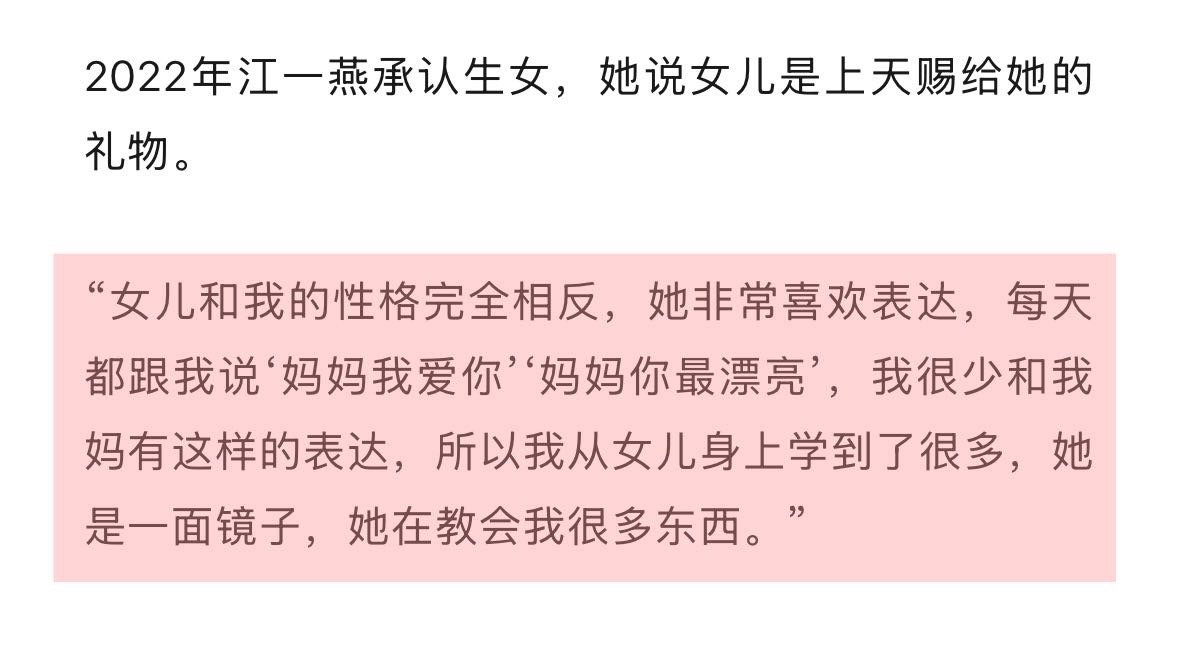 江一燕曾在采访中首谈女儿 在节目中官宣离婚,目前曝出前夫为导演、演员赵汉唐,两人育有一女,江一燕曾在《传闻中的她》首谈女儿,称女儿是上天给她的礼物,是她人生中的一面镜子,从女儿身上她学到了很多。 ​​​