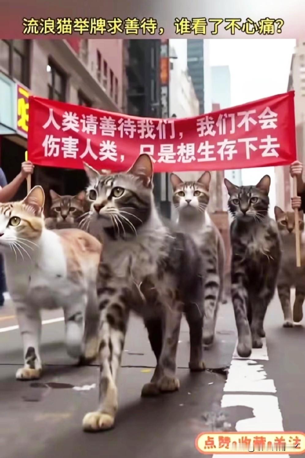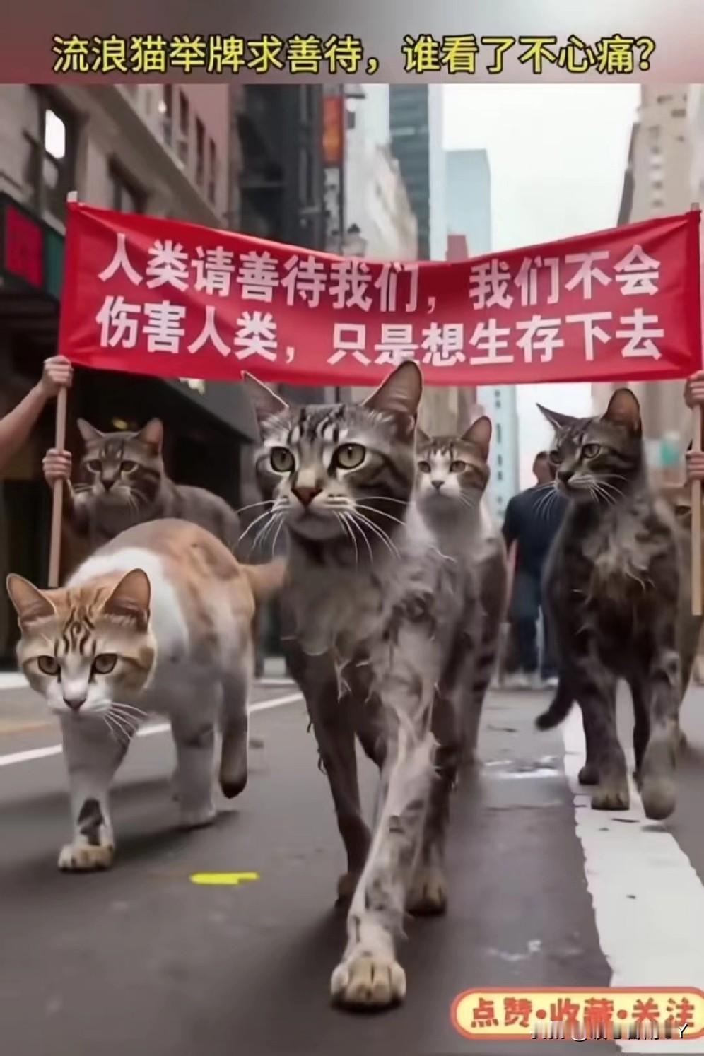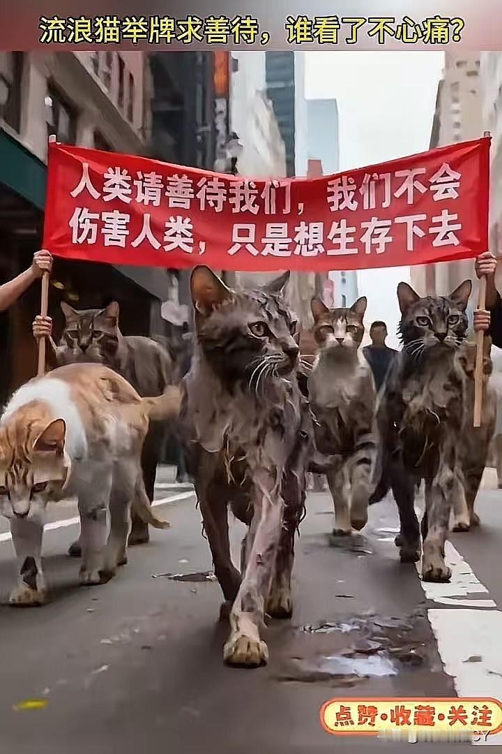 这些浑身沾满泥泞的流浪猫,举着“只想活下去”的牌子,徘徊在街头~ 它们从未想过伤害谁,只不过是在城市的角落,寻觅一口剩饭、一处避雨的地方。 它们的“诉求”,只不过是活着,就像风里的野草… 只盼人类能多一份温柔,不要驱赶、不要伤害,为它们留一点生存的缝隙。