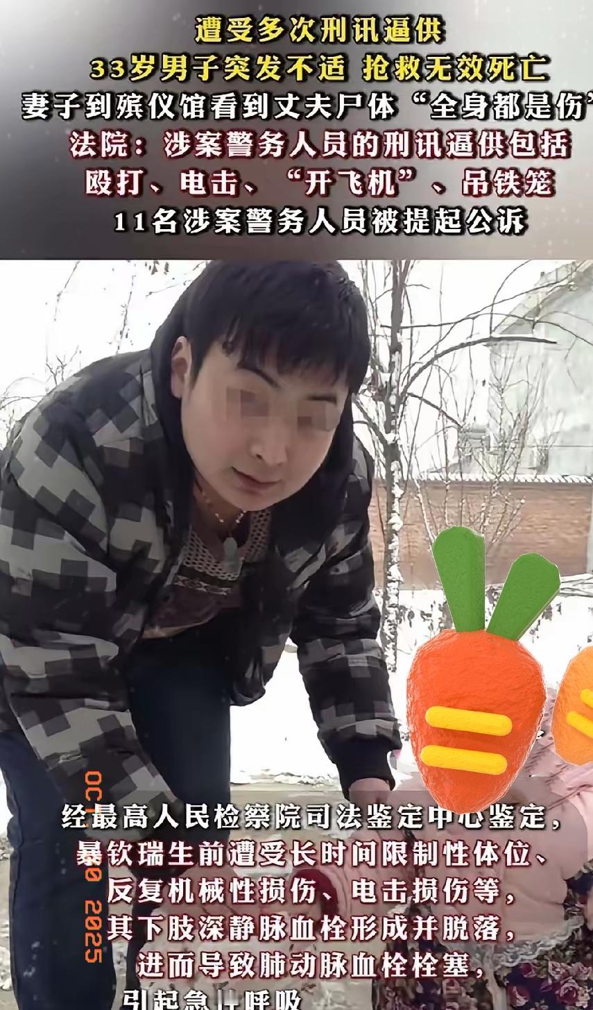 恶魔竟然在为人民服务的队伍里!33岁的暴钦瑞遭受多次刑讯逼供,最终抢救无效死亡,妻子在殡仪馆看到他“全身都是伤”。 谁能想到,本该护佑百姓的警务人员,会用殴打、电击、“开飞机”、吊铁笼这些远超底线的手段,把一个活生生的人折磨到丧命?最高检的鉴定写得明明白白,长时间的折磨让他下肢血栓脱落,最后连呼吸都没了,这哪是执法,根本就是施暴! 11个人被公诉确实解气,但更该琢磨的是,怎么才能把“刑讯逼供”的口子彻底堵死?要是权力没被盯紧,今天是暴钦瑞,明天会不会还有别人?别让“为人民服务”变成某些人作威作福的幌子,法治社会里,每一条人命都该被敬畏,每一次执法都得晒在阳光下。 你们觉得,除了严惩涉案人员,还该用什么办法防止这种事再发生?来评论区说说你的想法!