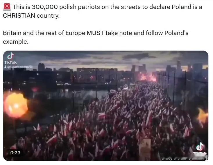 这是30万名波兰爱国者上街,宣示波兰是一个基督敎国家。 英国和欧洲其他国家需要效仿波兰的做法。 ​