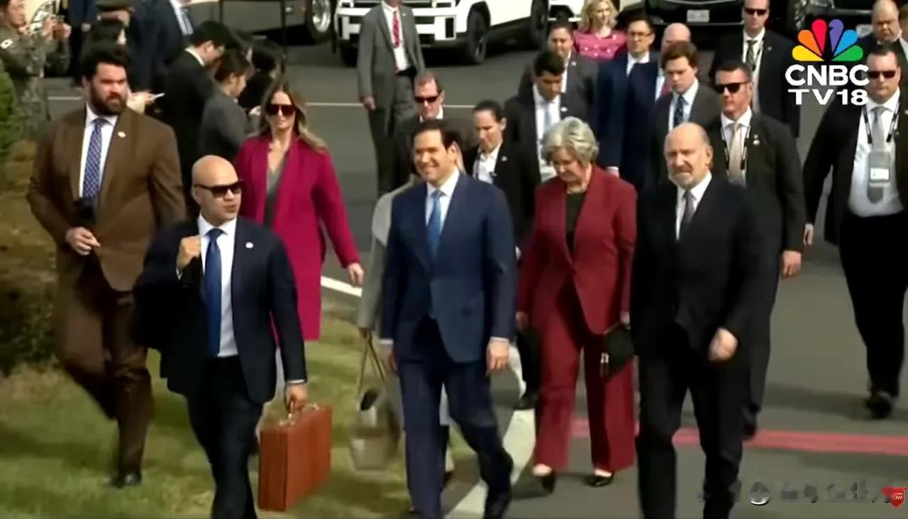 特朗普送走中方团队后,特朗普随团人员离开现场。中美釜山会晤 随行人员包括国务卿鲁比奥、财长贝森特、商务部长卢特尼克以及幕僚长等人。