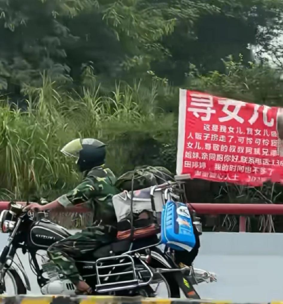远远望去还以为是这个骑行的人 后面插一个红旗 离近一点才发现是一个寻人启事 是一个父亲寻找女儿的 他每骑行到一个地方就会多一丝希望 就算不知道能不能找到 也从未放弃 这个寻人启事上最后一行写着“我的时间也不多了”,看了让人泪目 希望天下无拐 也希望这位父亲可以早日和女儿团聚 更希望所有的人贩子都被严惩[发怒]