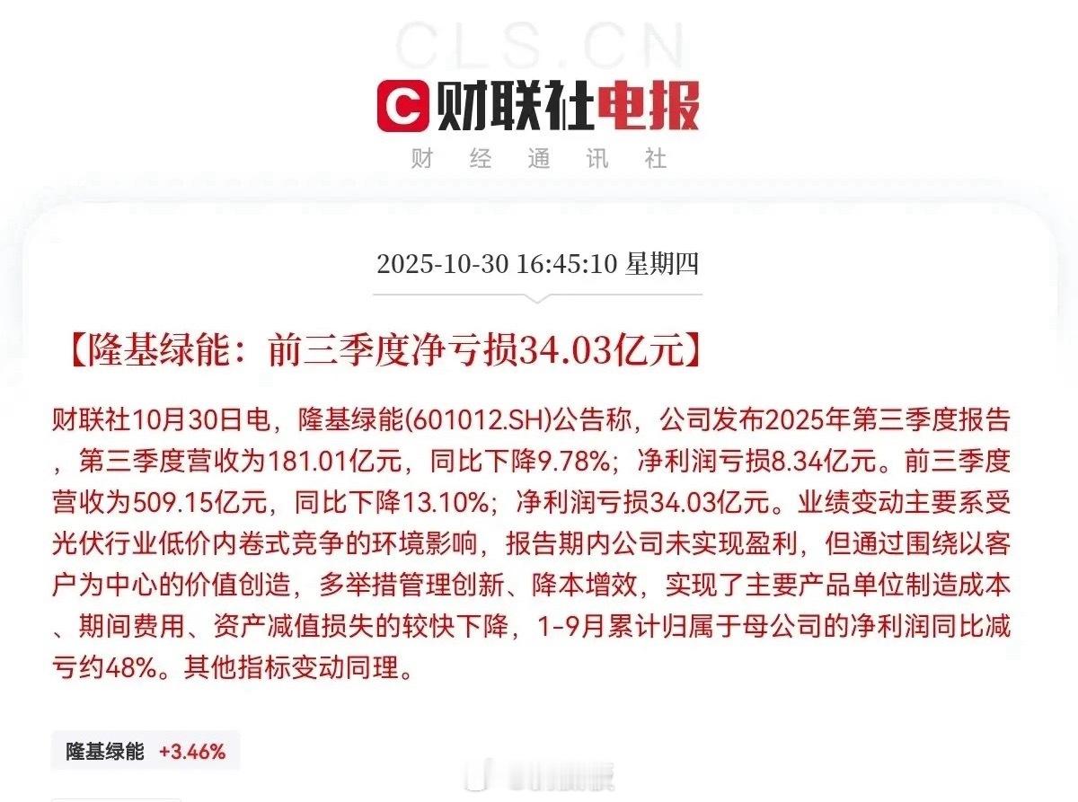 下午4点45分,隆基绿能发布了三季度业绩,1-9月归母净利润同比减亏约48%,是超级大利好