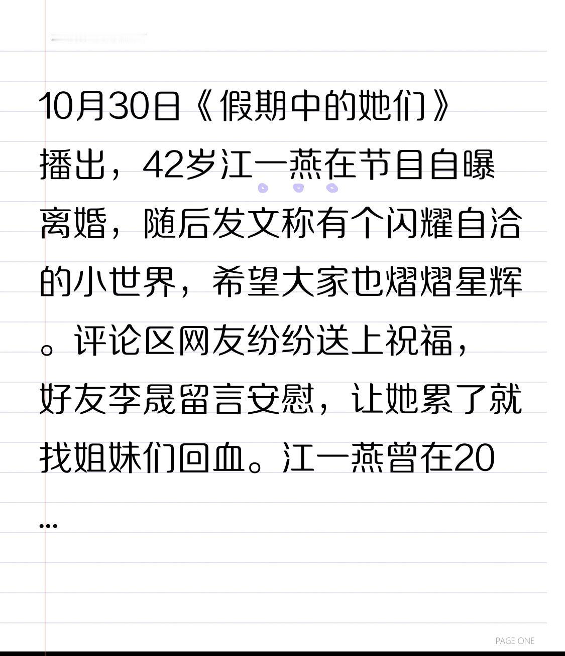 10月30日《假期中的她们》播出,42岁江一燕在节目自曝离婚,随后发文称有个闪耀自洽的小世界,希望大家也熠熠星辉。评论区网友纷纷送上祝福,好友李晟留言安慰,让她累了就找姐妹们回血。 江一燕曾在2022年承认结婚生女,全家定居云南乡村。狗仔多次拍到她前夫是演员、导演赵汉唐,两人因《七十七天》相识。这消息一出来,霍思燕和杜江可被牵连惨了,网友认错人指责他们离婚不顾孩子。不得不说江一燕内心强大,有争议还能自如面对镜头。