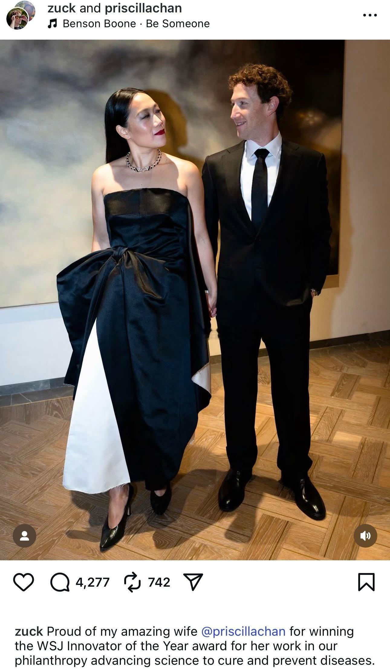 扎克伯格陪太太Priscilla Chan出席《华尔街日报》年度创新者颁奖典礼👇Priscilla Chan是得奖者之一[鼓掌]