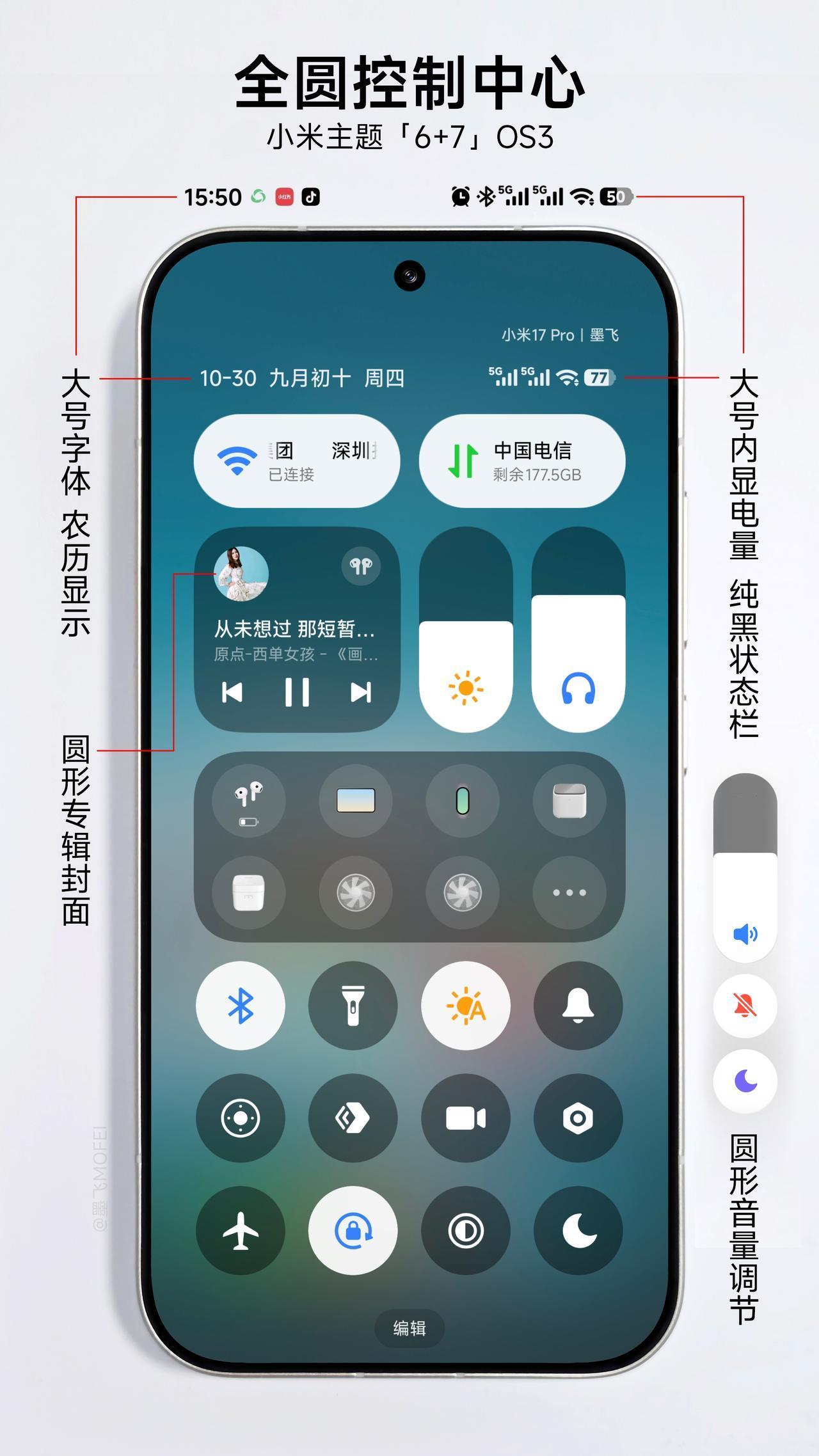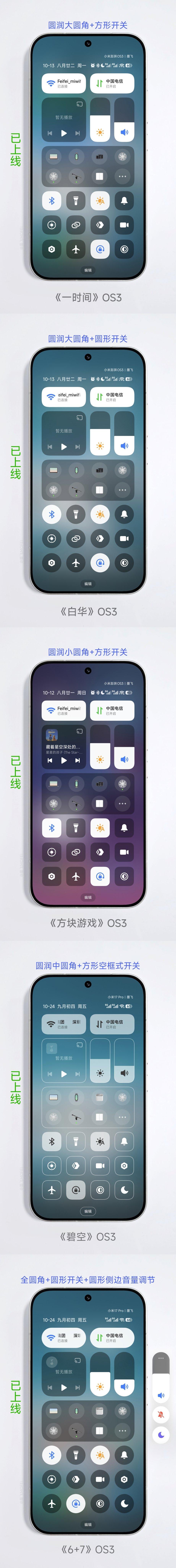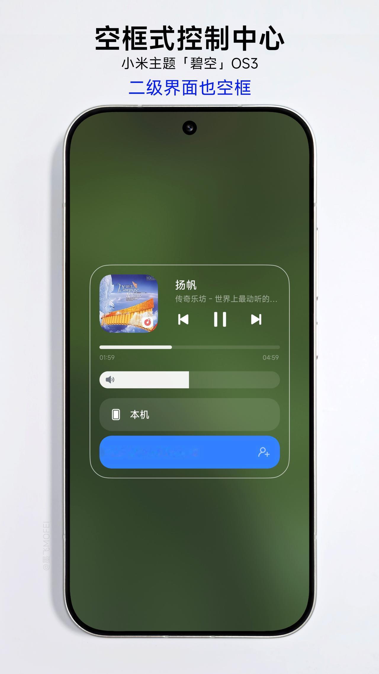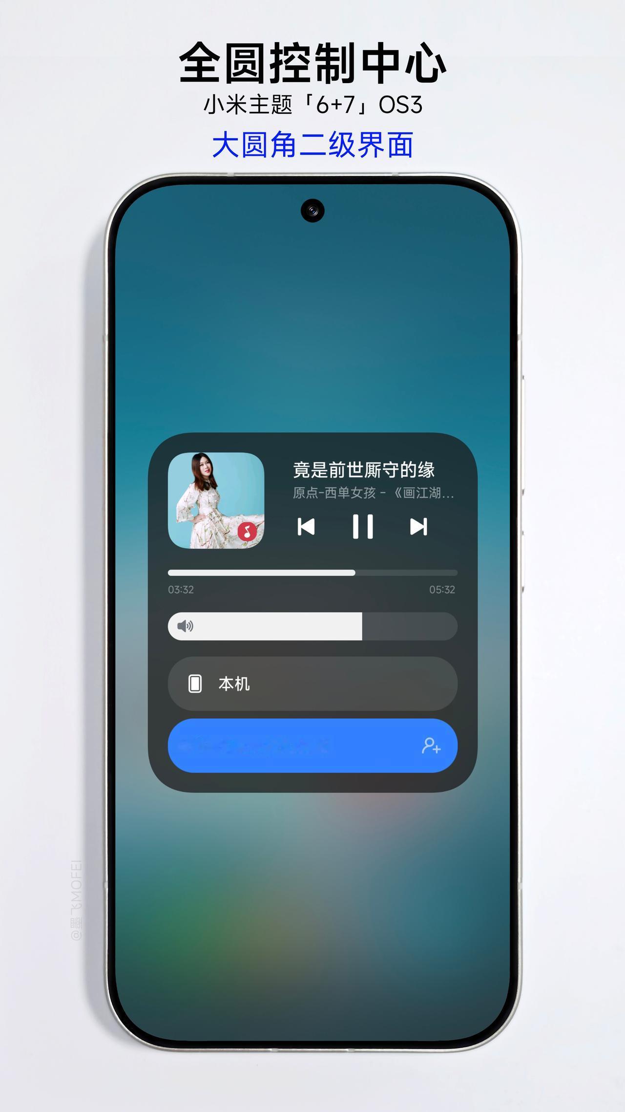 近期多款墨飞主题适配OS3,带来不同的控制中心样式。 今天两款更新,加上之前上线的三款,目前一共五款,均已全部上线,欢迎体验! 注:切换不同控制中心主题可能部分形状不能及时生效,请切换一次深色模式或重启手机即可。 小米主题状态栏 澎湃os3 小米17Pro
