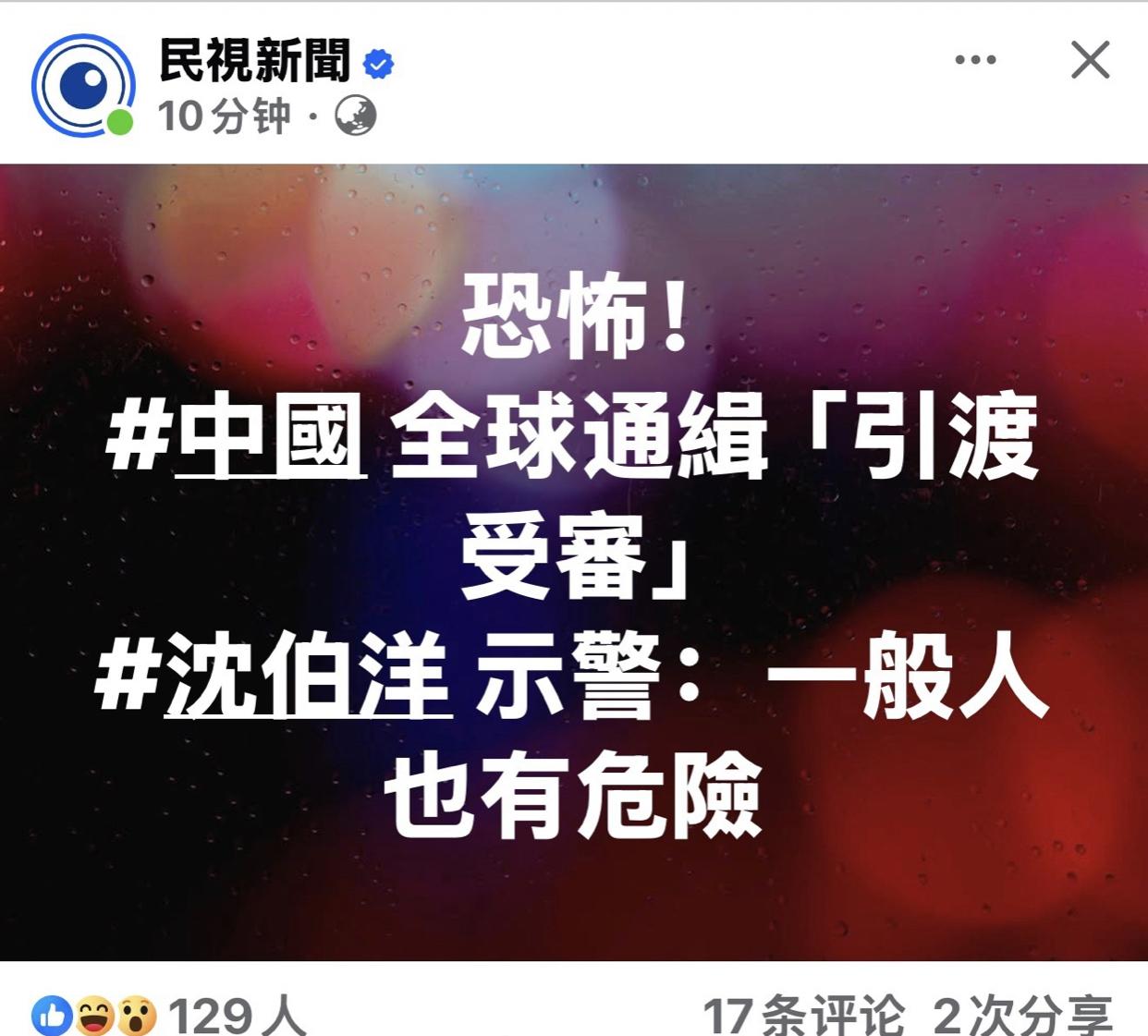 台媒:陆委会示警,沈伯洋等“惩独名单”可能会被大陆通报给国际刑警组织,沈伯洋危险了,恐怕会被引渡回大陆受审。 沈伯洋表示,他不怕,一般人也有危险。