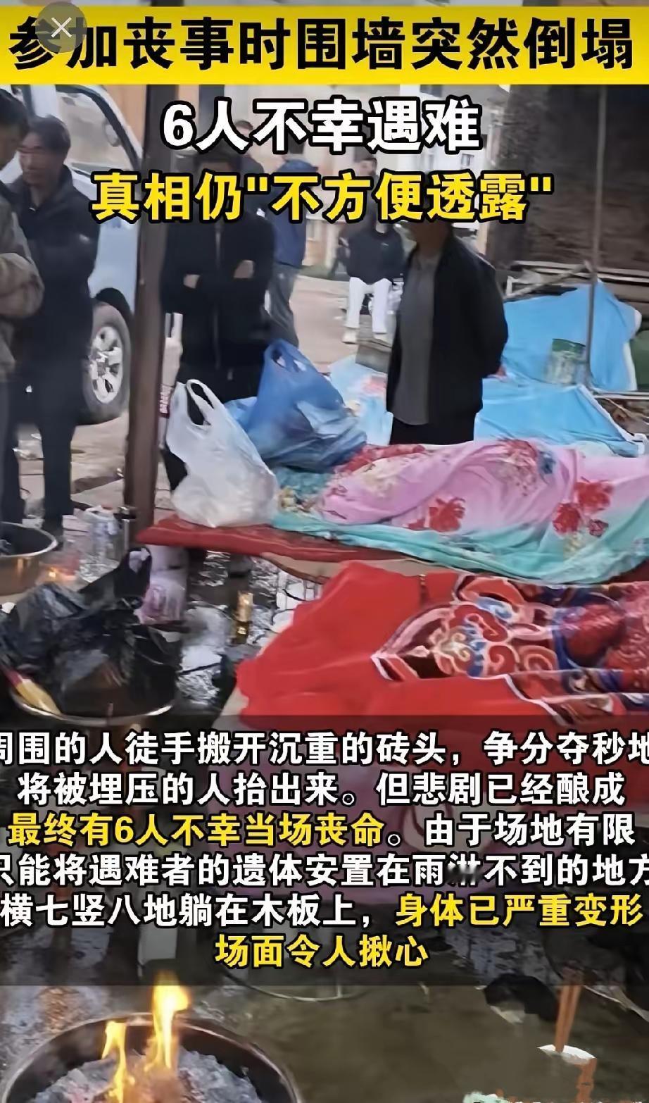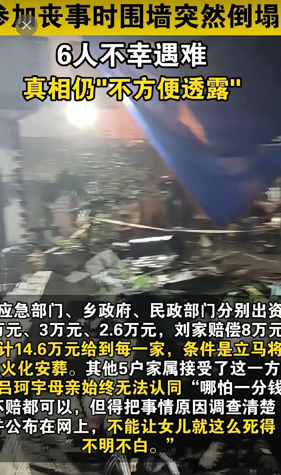 刚刷到这条信息!!悲上加悲!想不到的意外又夺走6条人命 近日发生的一场悲剧真是让人惋惜,一位年仅25的女大学生去参加一位逝者的丧宴,因为当时正在下雨吃饭过程中旁边的围墙倒塌,把女孩和其他5人掩埋,虽然周围人经过及时的救援,女孩和另外5个人还是失去了生命。 最后经过政府等部门和丧事主家共同出钱赔偿给受害方每个人14.6万元,并且要求立马火化安葬,女孩的母亲不同意,她说“哪怕一分钱不赔都可以,事情的原因也要调查清楚公布于众,不能让女儿死的不明不白” 培养一个大学生多不容易,这么大了却因为这样的突发事故走了,让母亲如何接受,她又怎么能让女儿不明不白的就走了,女儿都没了钱也就不重要了! 网友评论: 祸不单行啊! 农村陋习 逝者安息南无阿弥陀佛 人不能白死,必须得讧点钱!