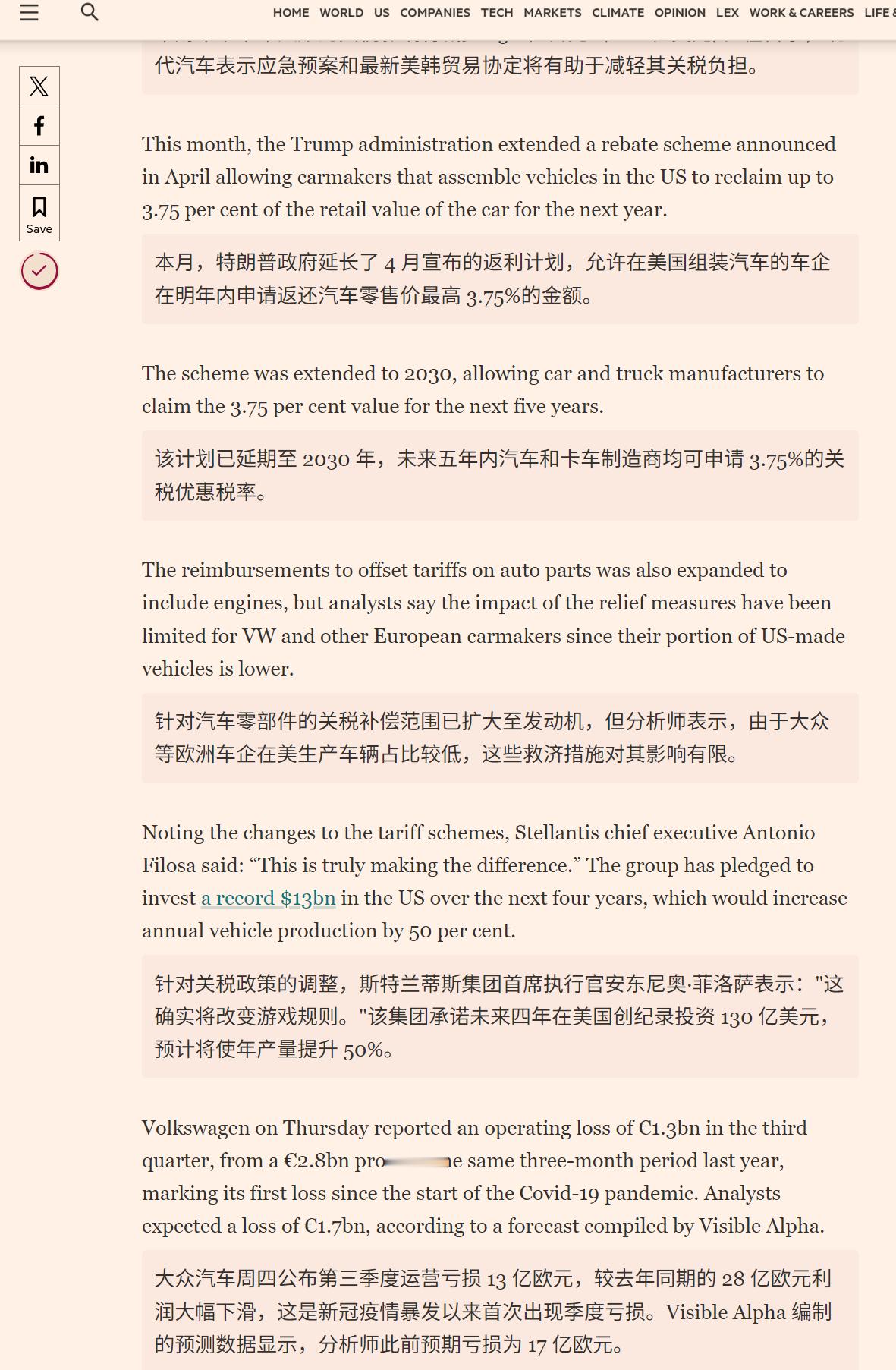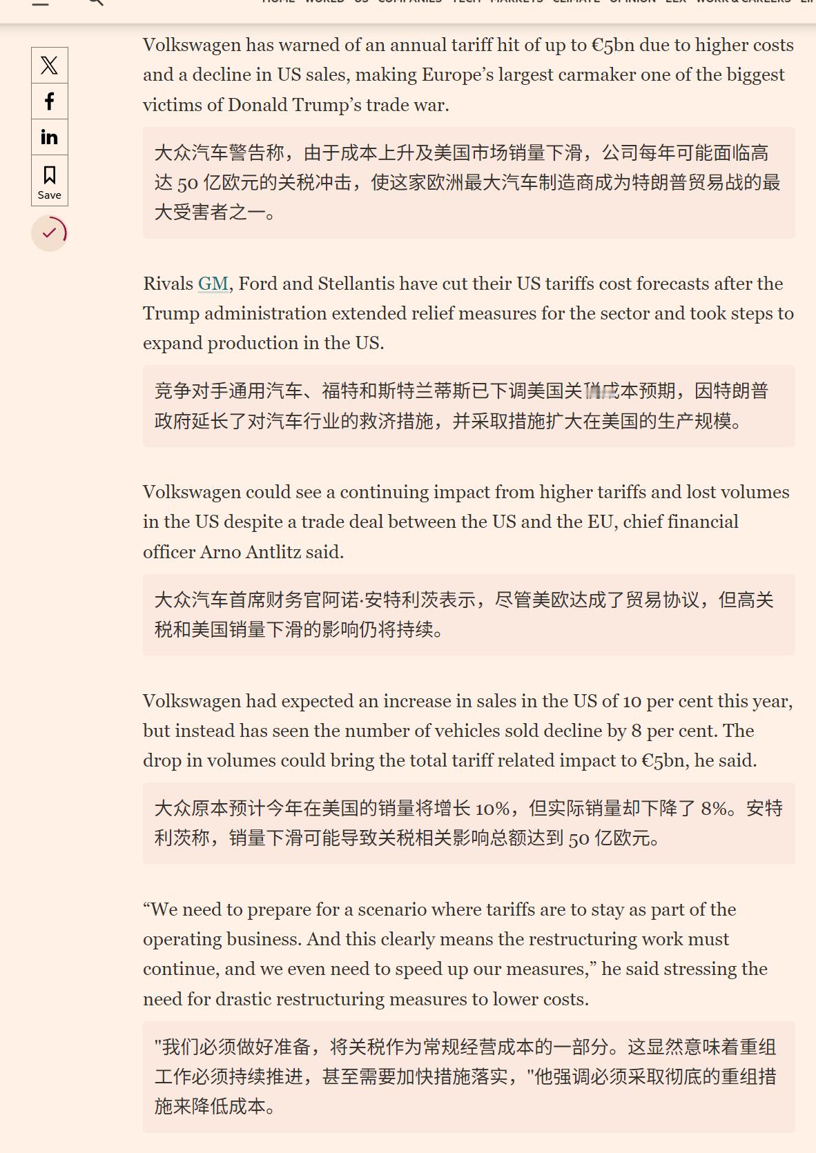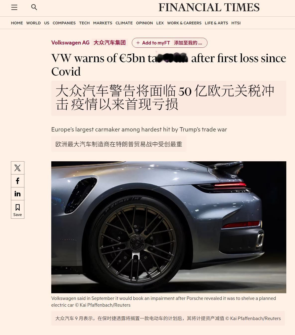 🔻大众汽车警告将面临 50 亿欧元关税冲击。