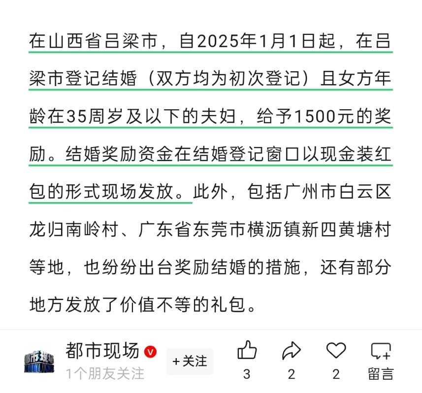多地发钱奖励结婚🔻在山西省吕梁市,自2025年1月1日起,初次登记结婚且女方年龄在35周岁及以下的夫妇,给予1500元的奖励。