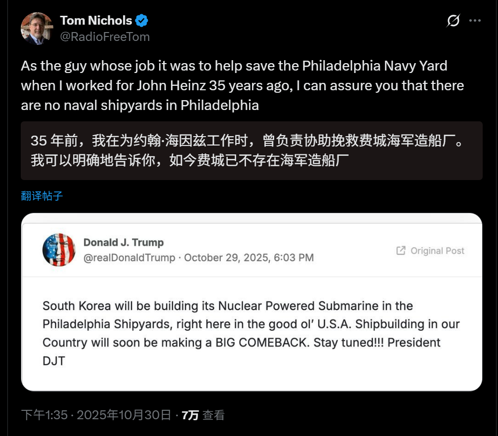 🔻《纽约时报》畅销书作者 Malcolm Nance 表示:“韩华造船虽位于费城海军造船厂的一部原址,是一家 2000 年左右开业的商用造船设施,但根本不具备建造潜艇的能力,更遑论核潜艇。他们接管了原属克瓦尔纳运营的船坞。这就是他脑海中几个零散念头碰撞出的产物,又是特朗普的信口胡言。”