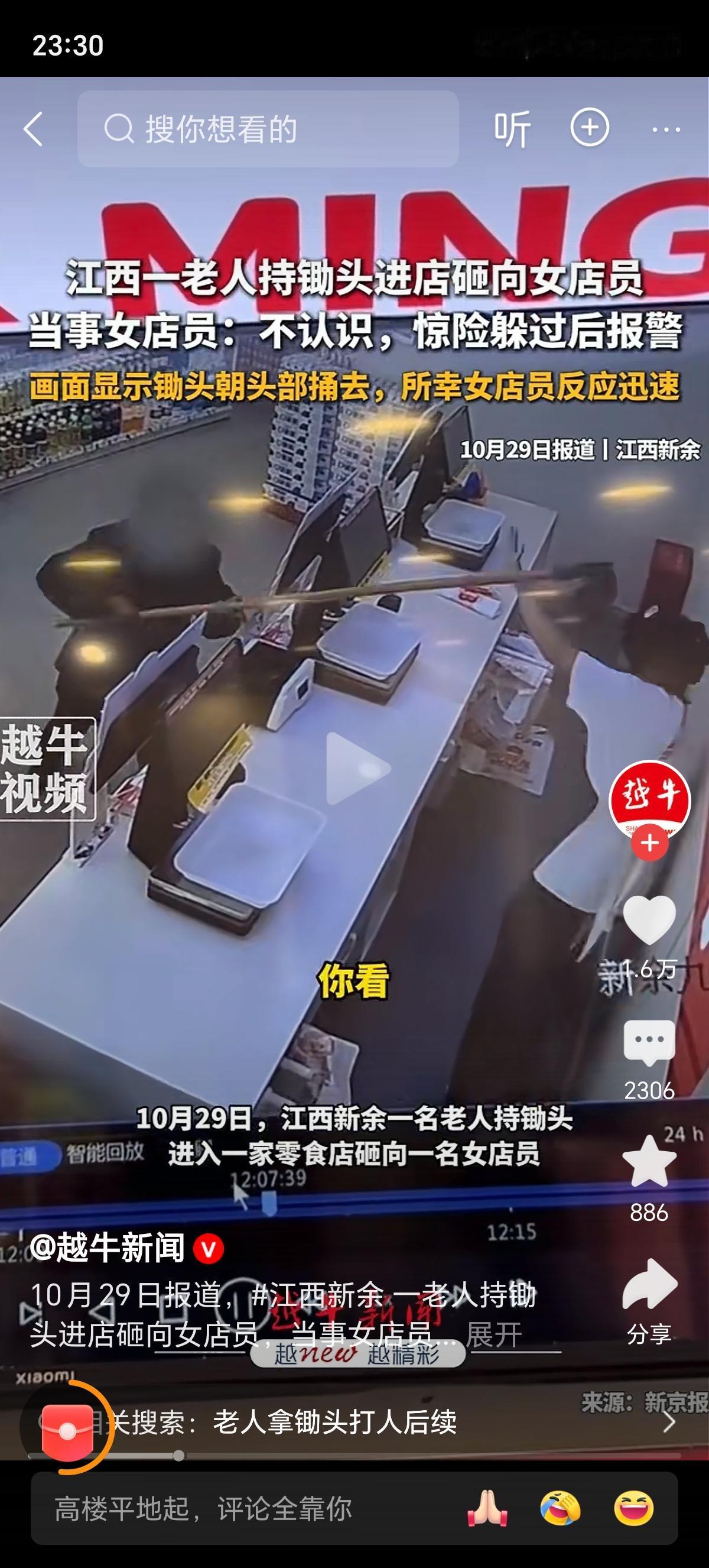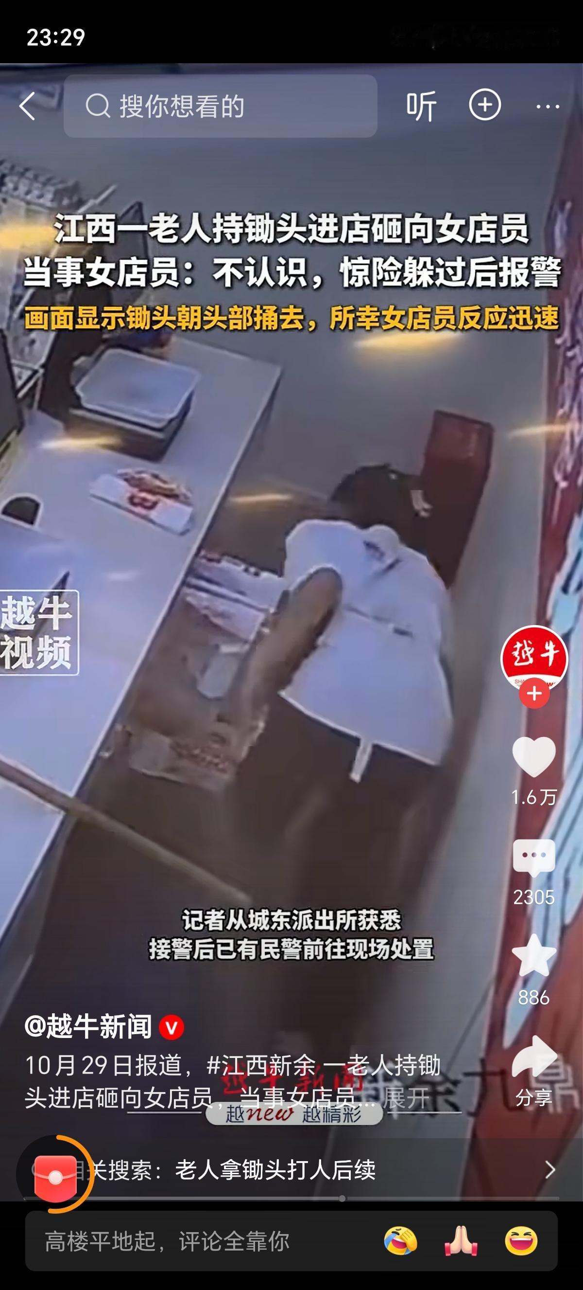 仗着自己岁数大行凶,觉的没人管的了他,或者犯病了,找个发泄对象。 10月29日中午,江西新余一家零食店内突发惊险一幕:一名老人手持长柄锄头闯入店内,径直走向收银台,突然挥锄猛砸正在工作的女店员头部。所幸女店员反应迅速,及时躲闪并逃离现场,未造成人员受伤。 据女店员讲述,她与涉事老人素不相识,无任何纠纷,对其突然袭击感到莫名其妙且极度后怕。监控显示,老人袭击动作果断,锄头几乎贴着店员头皮划过,店员逃离后,老人还曾拖着锄头追赶两步。 事发后女店员立即报警,新余市城东派出所民警迅速赶到现场,将涉事老人带走调查,并通知其家属到场配合。目前,警方已对双方进行笔录询问,事件具体起因仍在进一步核查中,网友纷纷呼吁查明老人动机及精神状态,强调年龄不应成为逃避法律责任的借口。