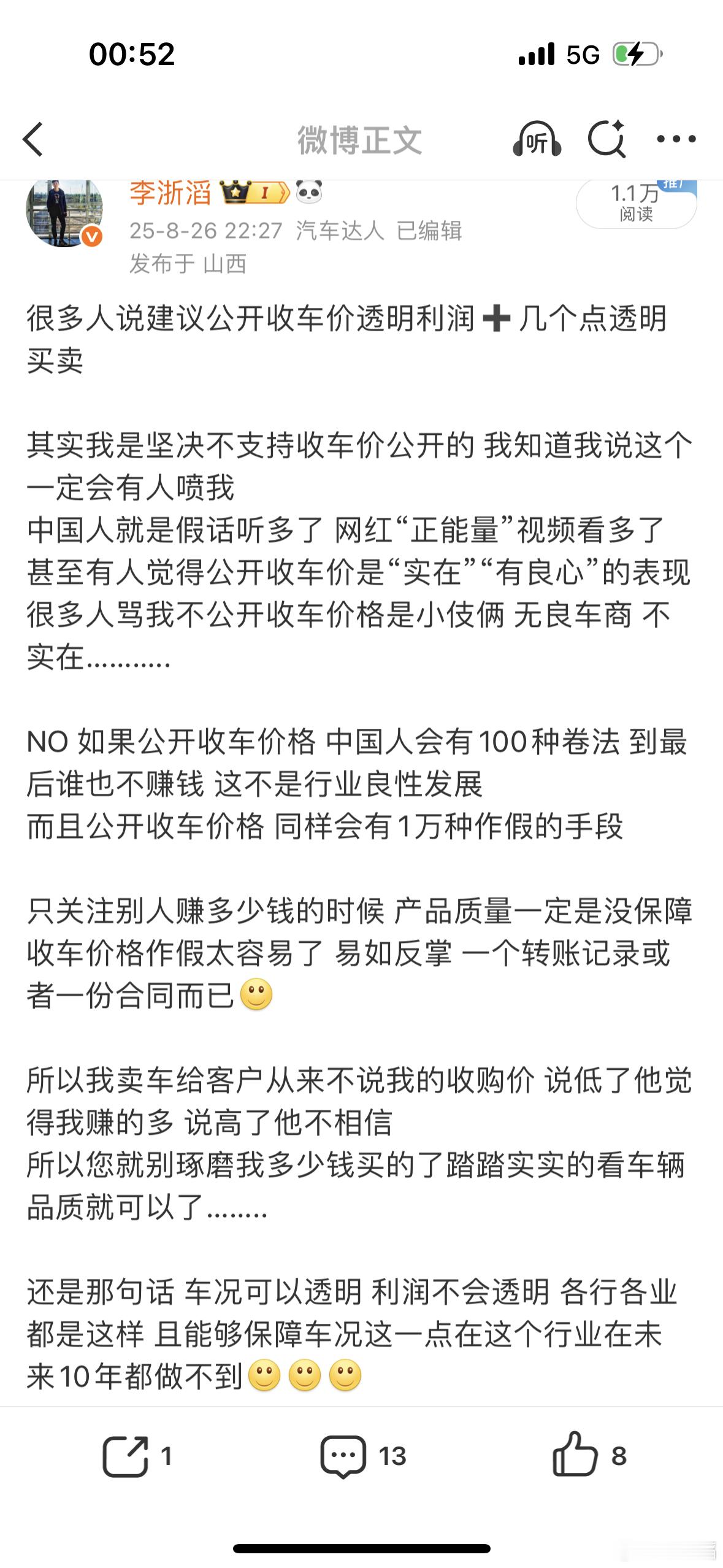 我是很不支持给客户看收车成本的 一旦这种风气盛行了之后 一定会有更多的造假 造假合同和转账易如反掌 这样做的后果就是都在卷价格 没人关注质量………..