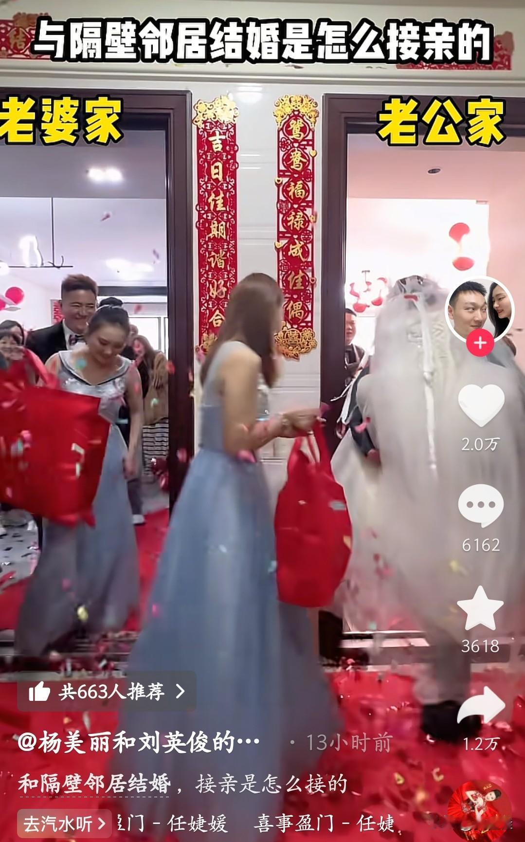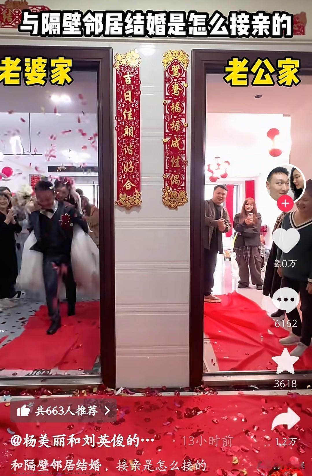 要说结婚接亲,还有比这更绝的吗?小两口是隔壁邻居,接亲的时候新郎从“老公家”门里一抬脚,就到“老婆家”了,婚车都不用安排!新郎拿着花喊“老婆我来接你了”,没一会儿就把新娘背回自家,伴娘提着红袋子乐呵呵跟着走。邻居直接变亲家,接亲跟串个门似的,这操作也太6了!把“近水楼台先得月”贯彻到底,看得人羡慕坏了,这婚结得也太省心还贼有看点! 要是两口子拌个嘴,那才叫热闹!这边刚有点动静,隔壁丈母娘顺着墙根就能听个一清二楚,保准立马“杀”过来调解。说不定还能上演“隔墙喊话劝和”名场面。新郎在自家挨训,新娘在隔壁偷着乐!