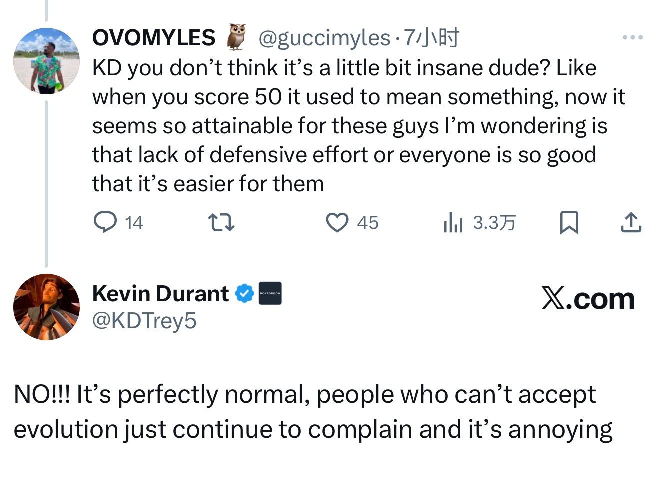 球迷2: KD你难道不觉得这有点夸张吗?以前拿50分意义重大,现在好像随随便便就能刷到。到底是防守懈怠了,还是现在球员强到得分如喝水?