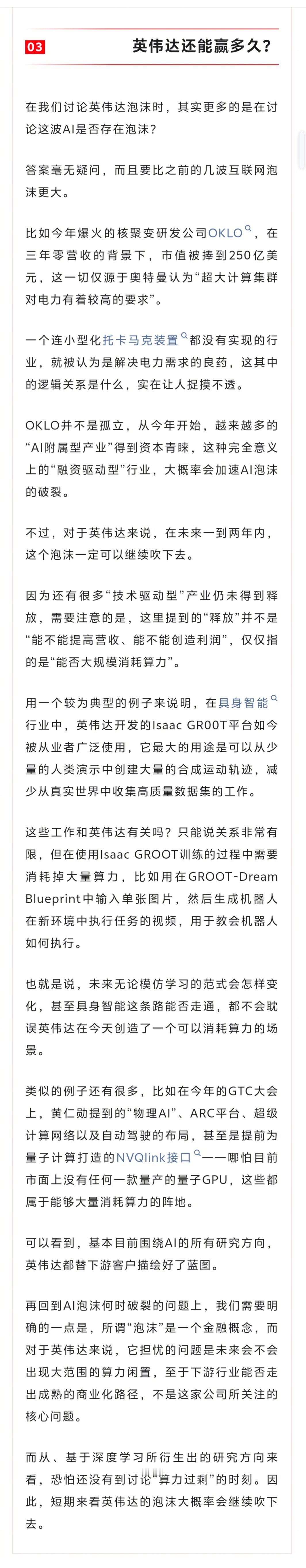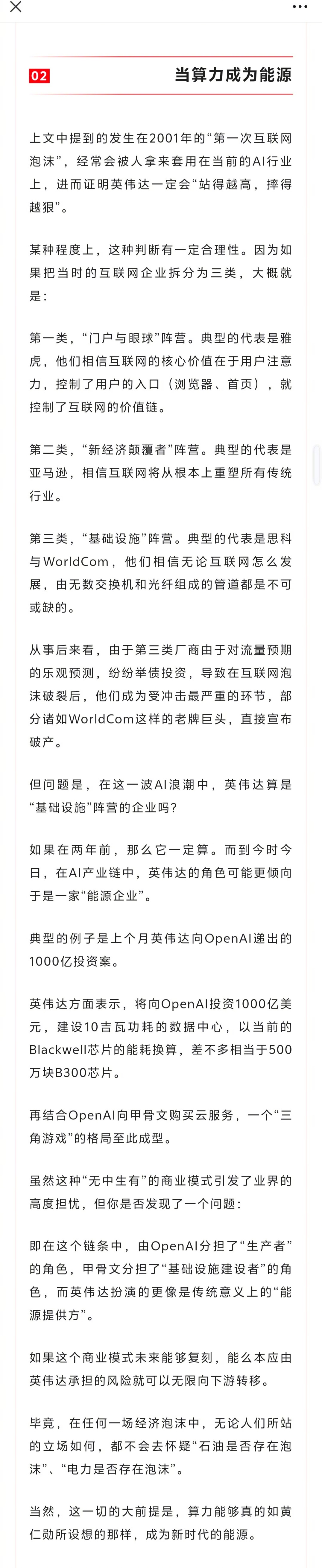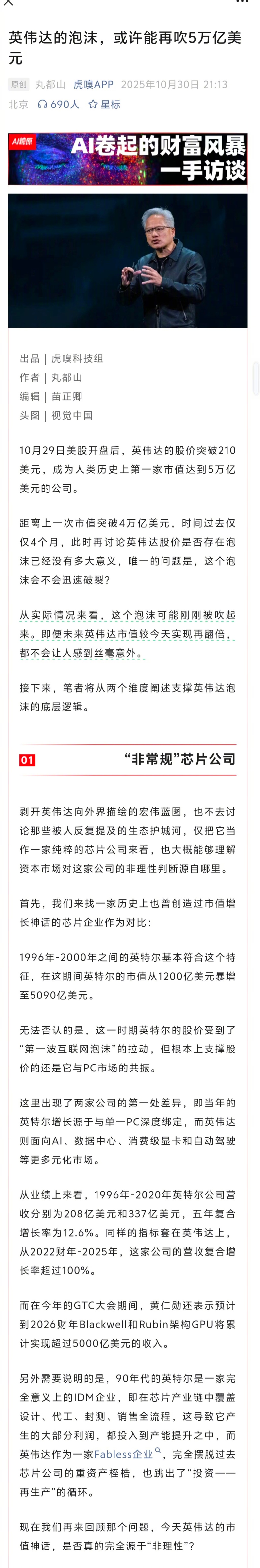 虎嗅这文章有点意思啊!个人觉得,英伟达还会吹起更大的泡沫,就看最后泡沫捏在谁的手里爆破。美股那几姐妹,你投资我,我投资你,商业互捧,一起吹泡泡,普通人还是不要参与了。(文章来自虎嗅)