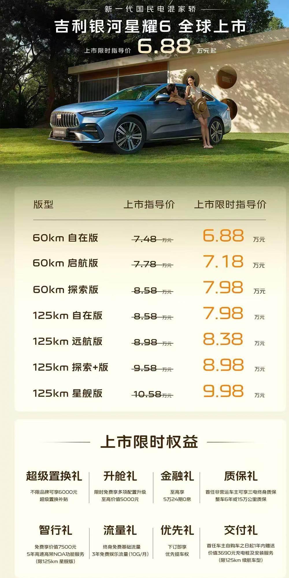吉利银河星耀6上市!6万多就能带走插混轿跑? 限时指导价6.88-9.98万(原价7.48-10.58万,这波降价诚意拉满) 车身4806mm+1886mm超宽(轴距2756mm,同级最长最宽) 亏电油耗2.8L/100km(加一箱油跑1700km) Flyme Auto车机+千里浩瀚H3辅助驾驶(城市NOA+流畅车机,智能配置直接拉到15万级水平) 7万级插混,要空间有空间(同级最长最宽车身),要省油有省油(2.8L亏电油耗),要智能有智能(城市NOA+车机流畅度拉满),还要啥自行车? 你们觉得吉利这波会抢走多少合资家轿的饭碗?[what]