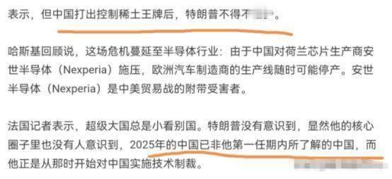法媒不客气的表示,特朗普屡屡犯错,又向中国退让了!10月31日,法新社刊文表示,三个星期之前特朗普还威胁要取消与中国的会晤。但中国打出控制稀土王牌后,特朗普不得不让步。超级大国总是小看别国。特朗普没有意识到,显然他的核心圈子里也没有人意识到,2025年的中国已非他第一任期内所了解的中国,而他正是从那时开始对中国实施技术制裁。 稀土这玩意儿看着不起眼,却是现代工业的“维生素”,从战斗机发动机到电动汽车电池,缺了它根本玩不转。中国是全球稀土供应链的绝对主导者,不仅储量丰富,更关键的是掌握了精炼技术和产能优势。 美国自己虽然也有稀土矿,但提纯加工环节严重依赖中国,想绕都绕不开。特朗普最初可能觉得这不过是张可打的牌,等真正摊牌时才发现,自己手里压根没有对等的筹码。这种误判不是偶然的,它反映出美国决策层对2025年中国产业升级和技术自主的现实缺乏清醒认知。 其实类似的误判从贸易战开始就层出不穷。特朗普最初挑起争端时,满心以为靠关税大棒就能让中国屈服。 他算盘打得响:中国对美出口远大于进口,经济上肯定更脆弱。可现实偏偏打了脸,中国作为一个12万亿美元体量的经济体,韧性比想象中强得多。 那边美国对华加征关税,结果自家企业生产成本先涨了上去,消费者物价跟着飙升;这边中国一边加速进口替代,一边深化与其他新兴市场的合作。到头来,美国贸易逆差没见缩小,反而推高了本土通胀,真是搬起石头砸自己的脚。 特朗普团队另一个致命误判是以为还能用“极限施压”那套老办法逼中国就范。他们一会儿在台湾问题上挑衅,一会儿在南海刷存在感,甚至还想联合产油国掐中国能源脖子。 结果呢?中国不但没被吓住,反而趁机推进能源供应多元化,同时通过“一带一路”优化全球能源治理机制。 等特朗普回过味来,发现国际能源市场早已从卖方市场转向买方市场,中国作为战略买家反而掌握了“天时、地利、人和”。这种战略被动局面美国以前几乎没遇到过。 技术封锁领域美国的误判更明显。特朗普第一任期就开始对中国高科技企业进行围堵,以为切断芯片供应就能遏制中国发展。 谁知中国反而化压力为动力,大幅增加研发投入,在人工智能、绿色能源等领域快速突破。 2025年第一季度的经济数据很能说明问题:美国GDP环比萎缩0.3%,中国却保持5.4%的同比增长。 这种增长差异背后,是中国系统性推进技术自主和产业升级的结果。现在不是中国依赖美国技术,而是全球产业链都离不开中国制造了。 特朗普的反复无常也削弱了美国的谈判地位。他一会儿对中国产品加税,一会儿又豁免;今天说要坚持到底,明天可能为股市波动悄悄让步。这种“交易式”外交风格短期看似乎灵活,长期却让盟友和对手都看清美国政策的不可靠。 法媒尖锐指出,特朗普最终只达成贸易战休战协议,这种协议虽能满足眼前市场需求,却无法维护21世纪两大强国间的未来平衡。真正有远见的战略家都明白,现在决定未来几年权力平衡的关键时刻,优势其实正在向北京倾斜。 就连美国传统盟友也开始不愿紧跟其对抗中国的政策。法国等欧洲国家明确表示不支持美国以对抗为核心的处理方法,更倾向于战略自主。这种国际氛围变化让美国对华施压的效果大打折扣。特朗普原以为能组建反华联合阵线,现在却发现连最亲密盟友都在打自己的算盘。 釜山较量可以看作是这场长征的一个缩影。特朗普政府想要速战速决,中国却坚持打持久战。当前达成的贸易休战虽然暂时缓和了局势,但根本矛盾远未解决。而且时间似乎站在中国这一边——中国有更稳定的政策环境、更完整的产业体系以及不断扩大的内需市场。 特朗普则要面对国内分裂的民意、华尔街的压力以及2026年中期选举的考验。这种情况下,超级大国若还沉迷于“美国定规矩”的旧梦,只会继续误判形势,犯下更多战略错误。 从更深层看,美国真正的问题在于无法接受一个多极化的世界。特朗普的“美国优先”本质上是想挽回正在逝去的霸权。 但世界秩序重塑已成定局,中国倡导的全球能源治理和“人类命运共同体”理念正获得越来越多国家的理解与认同。 这种历史大势不是关税战或技术封锁能逆转的。特朗普若继续低估中国的战略定力和发展韧性,只会让美国在大国竞争中越发力不从心。 法媒的评论虽然尖锐,却点出了问题的本质:2025年的中国已非昔日吴下阿蒙,而美国显然还没有做好心理准备来面对这个全新的现实。