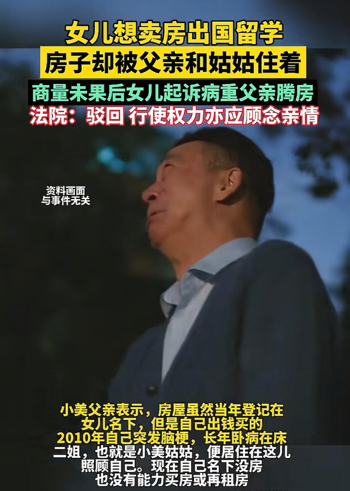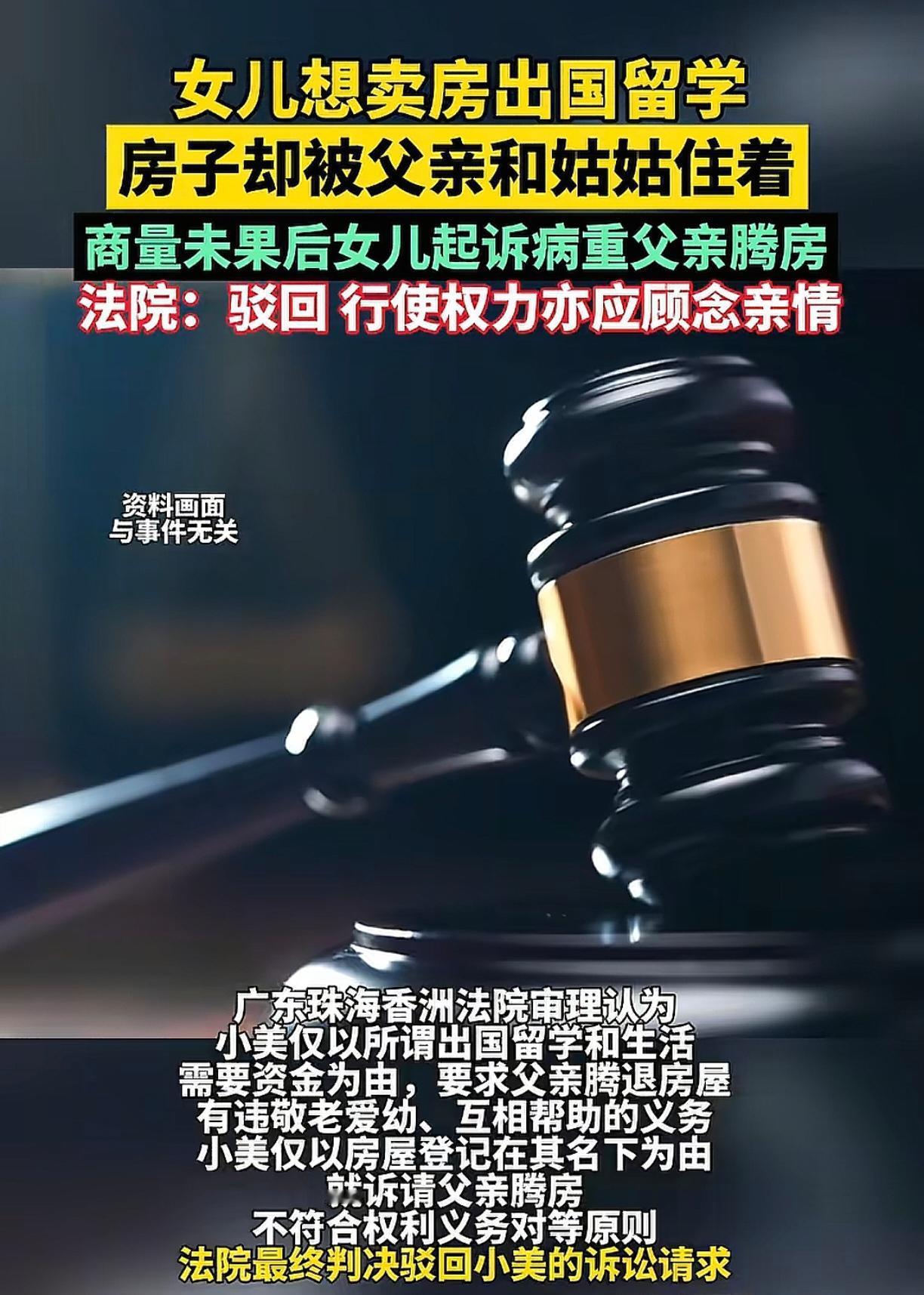 说实话,我是不懂这做女儿的是怎么想的。父母年轻的时候买了套房,写在女儿名下,想着女儿以后负担能够小一点。现在女子本科毕业在即,想要留学,觉得经济压力大,竟然想把父亲住的那套房子卖掉,把父亲赶出去,见沟通不成,直接起诉。 而且女子父亲早年生病,做过大手术,生活不能自理。这把父亲赶出去,是想让他睡大街嘛,丝毫不关心父亲的死活呀。 好在法院最后驳回了女子的诉求,让父亲能够继续住在房子里安度晚年。不然的话,这位父亲,恐怕真要面对老无所依的凄凉晚景了。