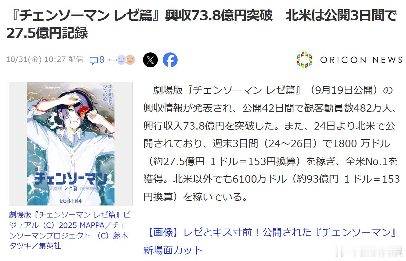 剧场版《电锯人 蕾塞篇》(9月19日上映)上映42天累计动员观众482万人次,票房收入突破73.8亿日元。