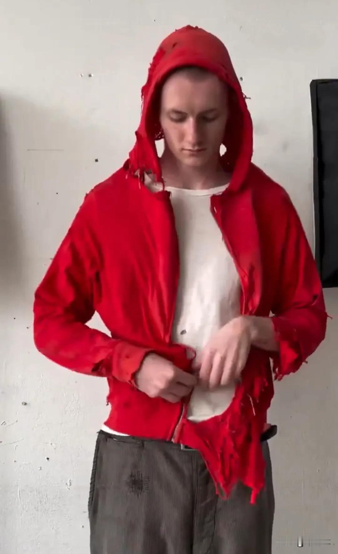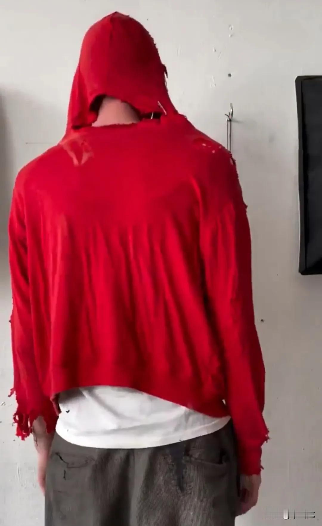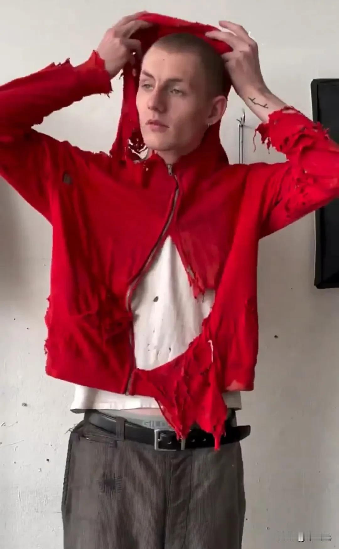 巴黎世家最新上市的春款男式茄克,950美元一件,第一批24小时内就全部售罄,评论区好评如潮。 听说巴黎世家的设计师们,每当灵感枯竭时,就会去流浪汉聚集的地方体验生活,跟流浪汉们一起风餐露宿,一起翻淘垃圾桶。 在此过程中灵光乍现,思路就豁然贯通,设计灵感就像干涸的泉水,突然止不住地涌出来。 一件优秀的作品就这样诞生了。 这种说法不知是真是假,但从这件红色夹克来看,应该是确有其事。 巴黎世家的乞丐装,每件都是独一无二的,可以做到外观相似,但做不到100%完全一样。 为什么会卖得这么贵,就在于它的稀缺性、不可复制性。 穿起来给人一种强烈的视觉震撼,有种大脑缺失的美,所以有钱人对它趋之若鹜。