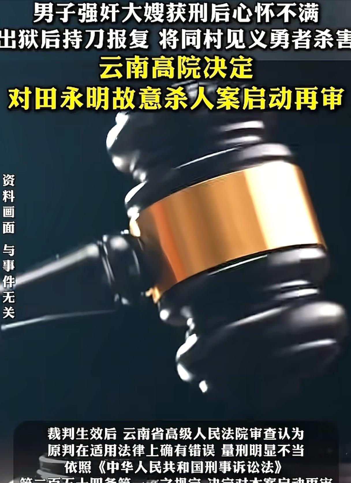 云南玉溪,男子因强奸大嫂和杀人未遂被判9年,出狱后,男子没有丝毫悔改之意,对大嫂实施报复。在这个过程中,一村民见义勇为,出面劝阻,男子对该村民连续捅刺,导致该村民当场死亡,还将其大嫂砍成轻伤,之后男子潜逃近20年,抓捕归案后,男子因故意杀人罪,被判死缓。可高院认为法律适用错误,量刑明显不当,对本案启动再审。 一个坐牢九年都没改造好的罪犯,刚出狱当天就犯下更残忍的杀人案,这事儿不只是田某一个人越来越坏,更得问问司法惩戒到底有没有起到作用。 田某的案子前后跨了二十多年,从最初的强奸、想杀人没成,到后来光天化日行凶,他的暴力一步步升级,而司法系统的应对,能看出很多复杂问题。 田某第一次用暴力犯罪是在 1996 年 6 月,他偷偷进了哥哥和嫂子家,把正在睡觉的大嫂侮辱了,后来这事传开了,他不觉得自己错,反而把火撒在大嫂身上。 同年7月,他拿着刀去大嫂家想灭口,还好被村里邻居拦住了,没真把人杀死,最后法院把强奸罪、故意杀人罪(没成)、还有窝赃罪加起来算,判了他九年有期徒刑。 但从后来的结果看,这九年刑期根本没管住他的极端性格,当时法律规定里,强奸罪判八年、杀人未遂判一年,这么判是有依据的。 可田某这种把错全怪在受害者身上,还想用杀人解决问题的人,九年刑期根本不够有威慑力,当初没让他受到和罪行匹配的惩罚,可能早就为后来的悲剧埋下了祸根。 监狱的改造也完全没在田某身上起效,2002 年 7 月 15 日,他因为 “表现好” 减了刑,出了狱,可他半点没变好,刚走出监狱大门,就揣着一把尖刀,直接往大嫂家去,想报复她。 这种刚出狱就马上再犯罪的情况,就是法律里说的 “累犯”,而且他心里的恶意和伤害人的危险程度,已经明明白白摆在那了。 更吓人的是,他的暴力行为还变本加厉了,当时同村的村民刘某路过看见他要找大嫂麻烦,就上前劝架,没想到田某直接把气撒在刘某身上,本来是冲着大嫂报仇,结果连无辜的劝架人都下死手。 他不管不顾,拿刀子猛戳刘某的胸口,当场就把刘某杀死了,这就能看出来他现在只要有人挡着他,不管是谁都想杀。 砍死刘某后,田某还没罢手,接着追上大嫂,拿刀捅伤了她(后来鉴定是轻伤),直到其他村民赶来拦着,他才慌里慌张跑了,这一跑就躲了快二十年。 不过 “天网恢恢,疏而不漏”,2022 年 2 月,躲了这么久的田某终于被警察抓住了,到了法庭上,田某和他的辩护律师还编瞎话,说 “刘某是被大嫂推到我刀上的”,一点后悔的意思都没有。 法院最后判定他犯了故意杀人罪,加上他是累犯,得从重判,给他判了死刑、缓期两年执行,但这个判决在这案子里,惹来了很大争议。 田某身上全是该重判的情况:刚出狱就犯罪(累犯)、出狱当天就动手、杀了见义勇为的无辜人、造成一死一伤的严重后果、逃了近二十年、开庭时还撒谎没悔意。 在这种情况下,很多人都疑惑,“死缓” 到底算不算 “从重处罚”? 尤其是对那个站出来劝架却白白送命的刘某,还有他的家人来说,这样的判决好像没让他们感受到该有的正义。 也正是因为这一点,云南省高级人民法院在今年十月二十八,拿 “之前的判决在法律适用方面有问题,判的刑明显不合理” 为理由,决定重新审这个案子。 这个谨慎的司法举动,说明司法系统正在重新考虑:像田某这样心里的恶意极深、根本没法改造好的罪犯,到底判什么样的刑罚,才能让个案得到公正处理、告慰死去的人,还能给社会起到足够的警示作用。 正义有时候会来得晚,但云南高院决定重新审理,就是为了保证这次正义不会以 “判得不合适” 的方式缺席,最后的判决结果,也会给 “犯了罪该怎么罚” 这个一直存在的问题,留下一个符合当下司法情况的深刻答案。