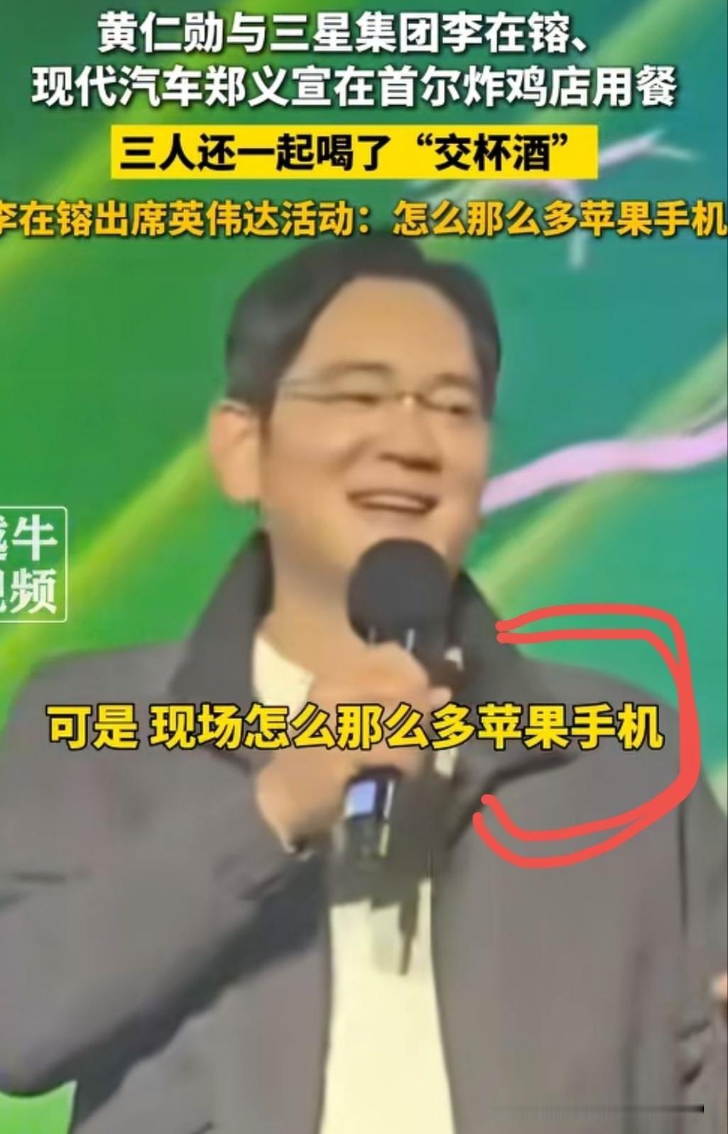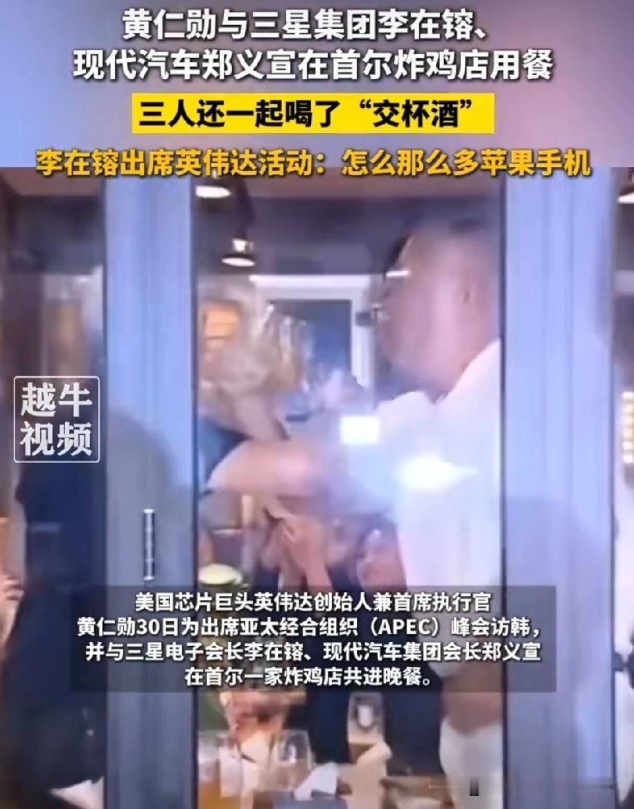 黄仁勋与三星集团李在镕、现代汽车郑义宣在首尔炸鸡店用餐!然后他们还亲密的喝了“交杯酒“! 然后李在镕出席英伟达活动,时候就郁闷了:怎么那么多苹果手机? 他现场吐槽:可是现场怎么那么多苹果手机?瞬间引起全场大笑! 最近老黄跟韩国关系很好啊!