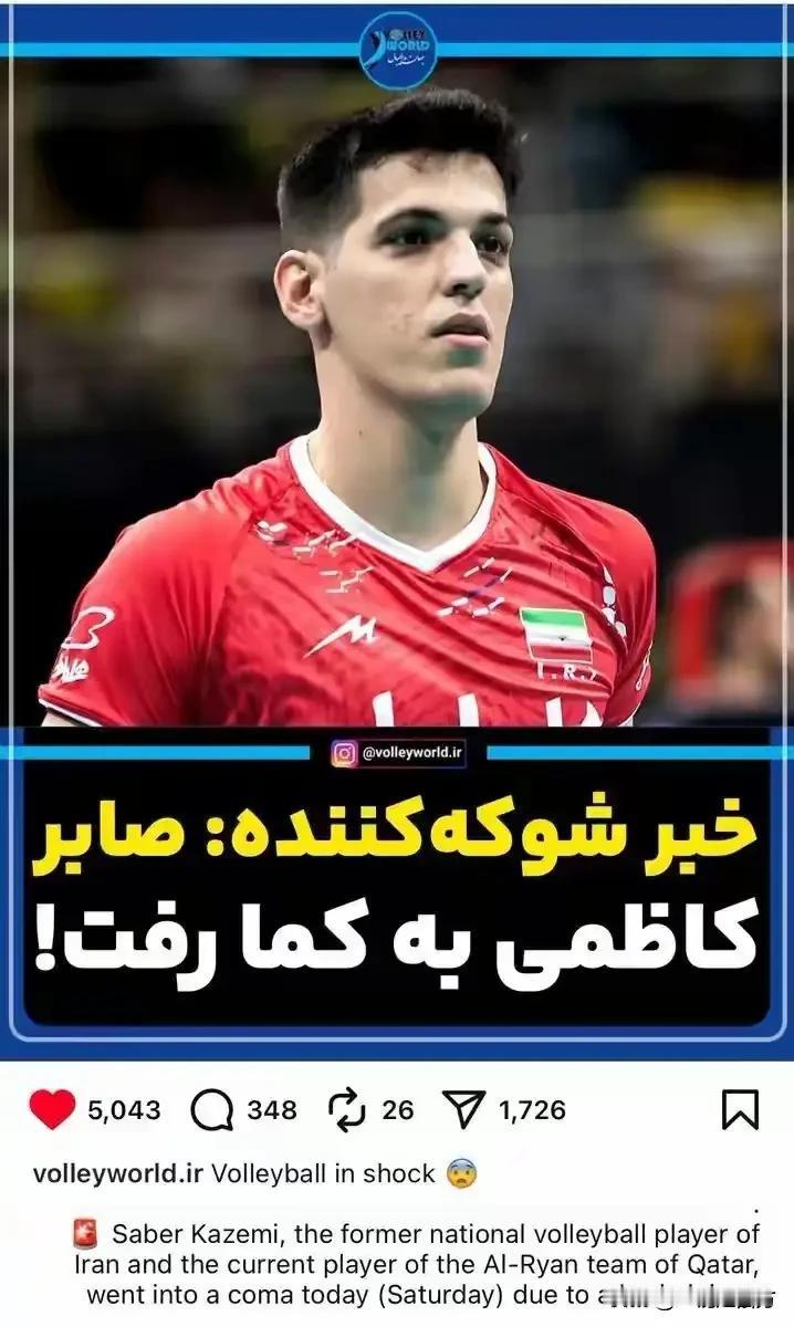 半个月前训练结束后在酒店泳池遭遇意外、头部受重伤的伊朗男排26岁国手萨博·卡泽米,经过救治无效,被宣布脑死亡。