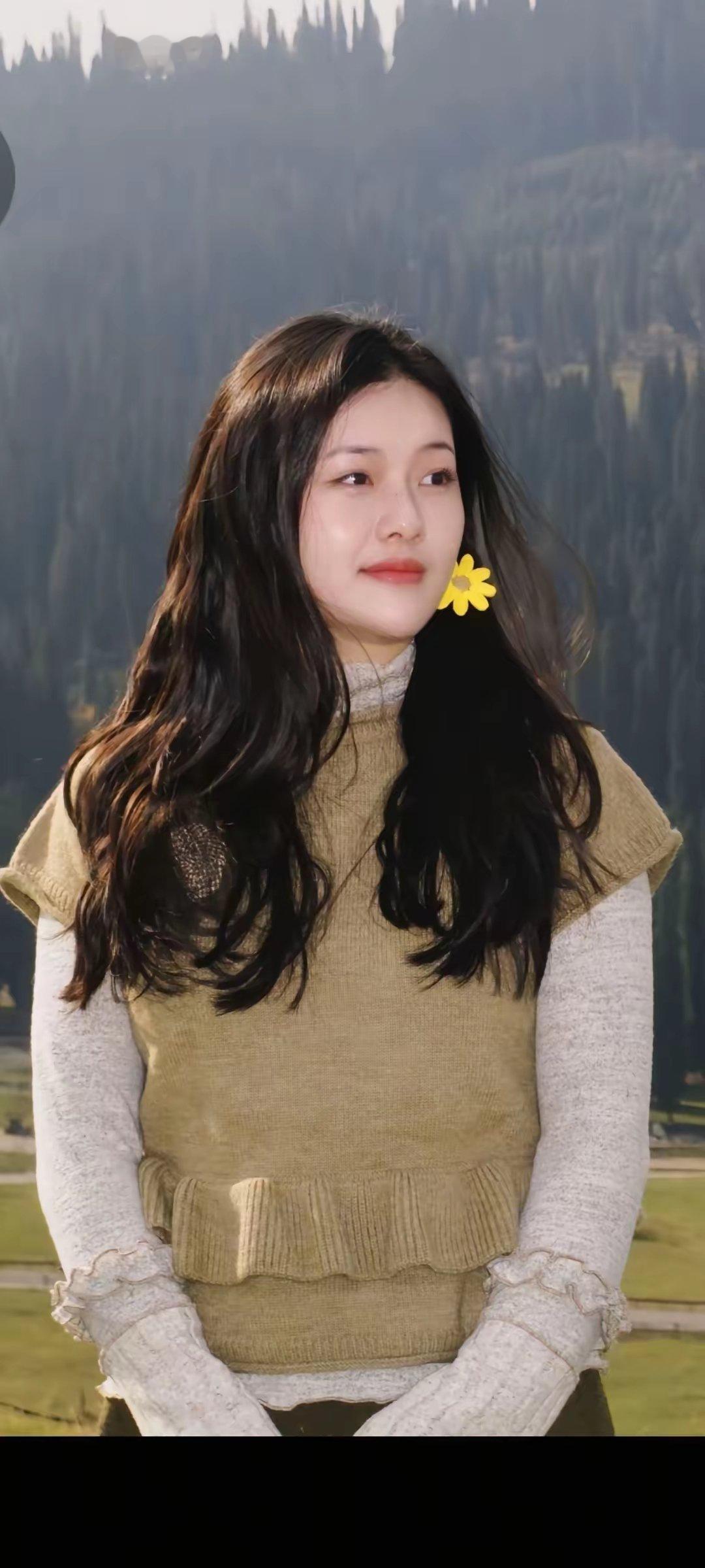 小悠来新疆伊犁游玩,她披散长发,身穿毛裙,打卡伊犁的美景。