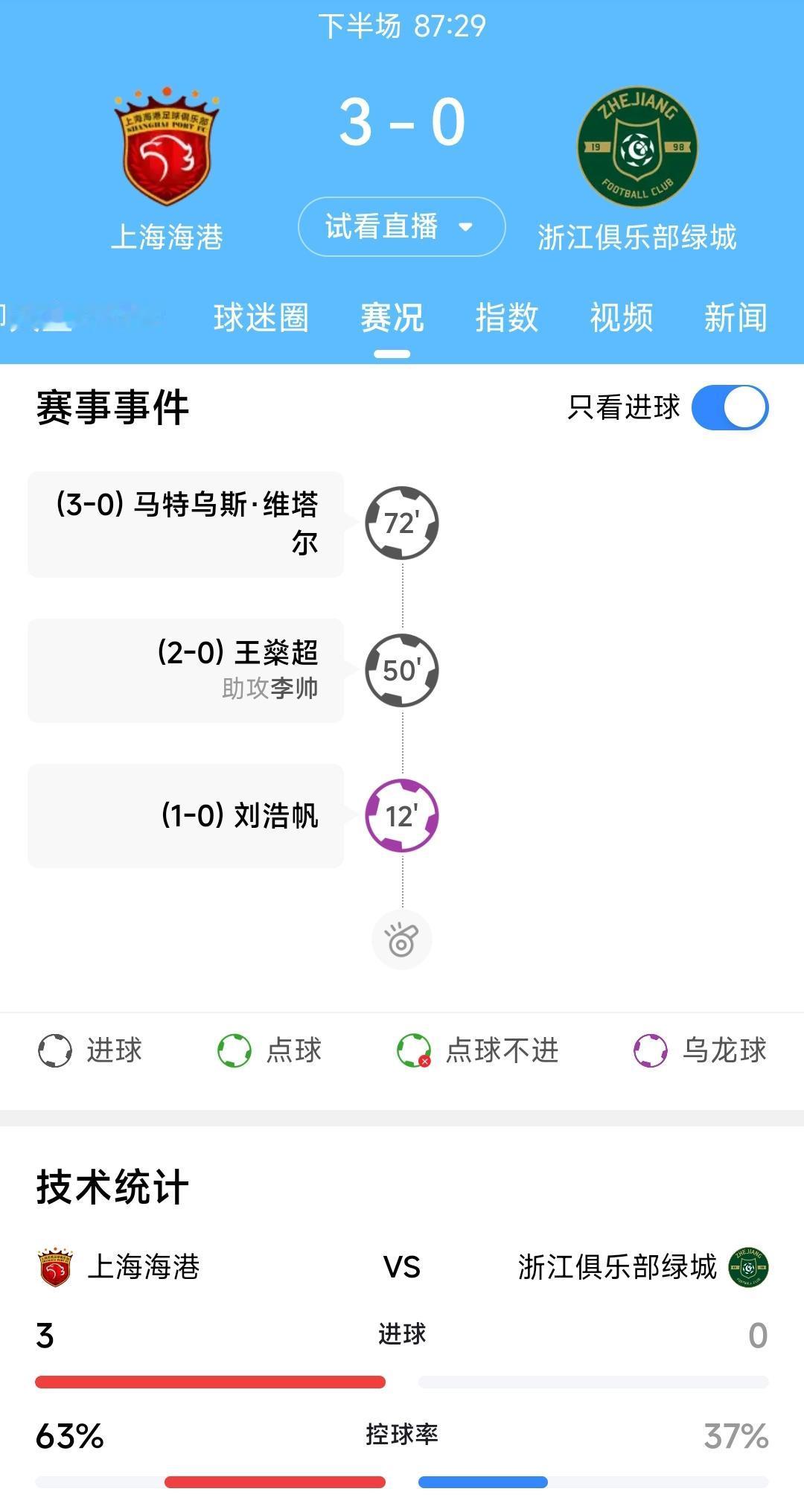 上海上港状态很不错,目前3:0领先杭州绿城,更难得的是这场上海上港控球率高达63%,因此能拿下这场比赛真的实至名归。 放眼未来我希望上海上港今后要继续补强中场与后卫,如果今后能在亚冠联赛有出色的发挥我相信大家会更开心,让我们拭目以待。