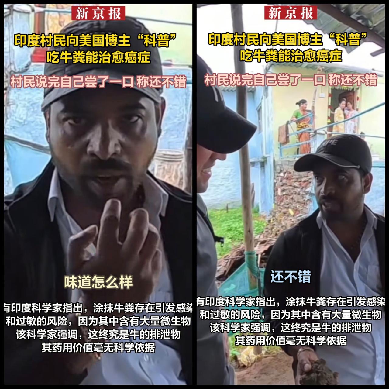 牛对于印度人来说堪比神明呀,在他们眼里,感觉牛全身都是宝。 昨天,一美国博主发表去印度游玩的视频。当地村民向博主科普当地的“神牛”,说吃牛粪能够治疗癌症,并声称得到科学证明。博主期间还闻了闻牛粪,表示味道很上头。 然后博主就问村民吃多少,让村民演示一下。没想到村民想都没想,直接用食指沾了一点放到了嘴里,还表示味道不错。不得不说当地的居民太实在了[笑哭]。 三哥这么信奉牛,话说,我是不是可以在国内搜集牛粪,然后出口到三哥那边,感觉还挺有商机的[呲牙]。印度 迷惑行为
