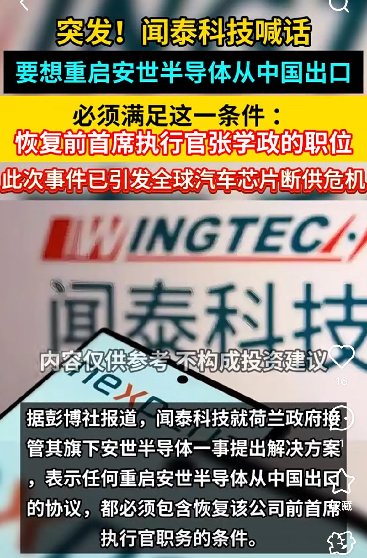 就在此刻!又震惊了! 闻泰科技跟荷兰方面的博弈彻底摆上台面, 这哪是企业纠纷,分明是中企出海反制保护主义的教科书级案例。 闻泰直接划下红线:想重启协议?先恢复前CEO职务,把控股权还回来,再撤销那莫须有的技术窃取指控。 要知道闻泰本就是安世的合法老板,哪有自己偷自己技术的道理? 更妙的是中方的配合,稀土出口升级管控精准卡了关键环节,安世中国这边立马独立运营、人民币结算,荷兰总部反倒成了“局外人”。 这已经不是简单的僵持,而是用“技术自主+资源反制”破解地缘套路。 别再觉得海外并购只是“买买买”了,闻泰这一战说明,掌握核心产能和供应链主导权,才是对抗无理打压的底气。 你觉得荷兰会先松口吗?中企出海还该备哪些“防身术”?评论区聊聊~ 闻泰电子 闻泰资产 荷兰科技产业 荷兰国际集团 闻泰科技能否顺利重启安世半导体出口 安世半导体事件引发了怎样的供应链危机