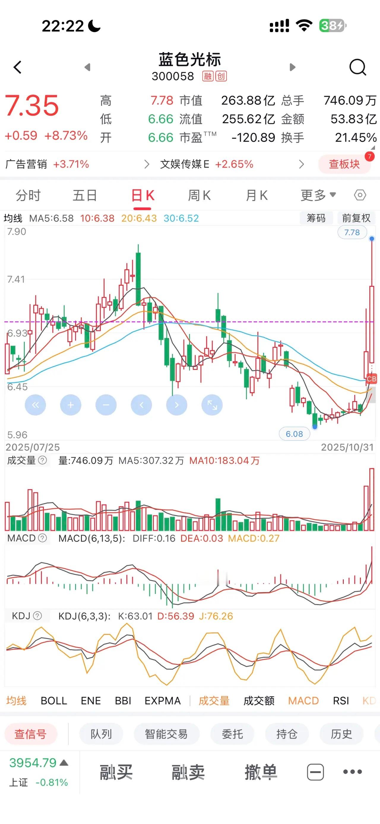 今天根据量能战法进了蓝色光标,目前小有收获中!