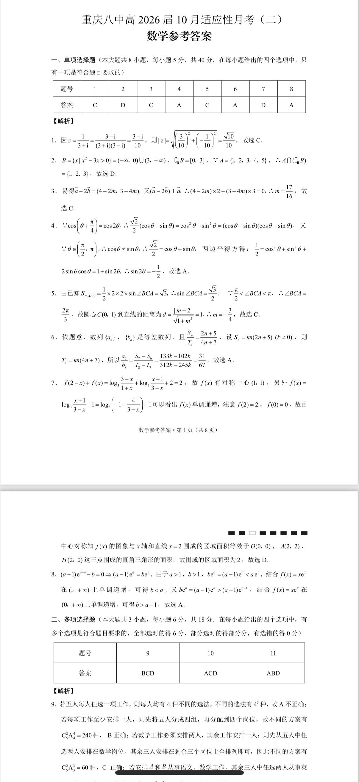 重庆七龙珠之重庆八中2026届高三第二次月考数学试题及答案,有很多真题的影子!