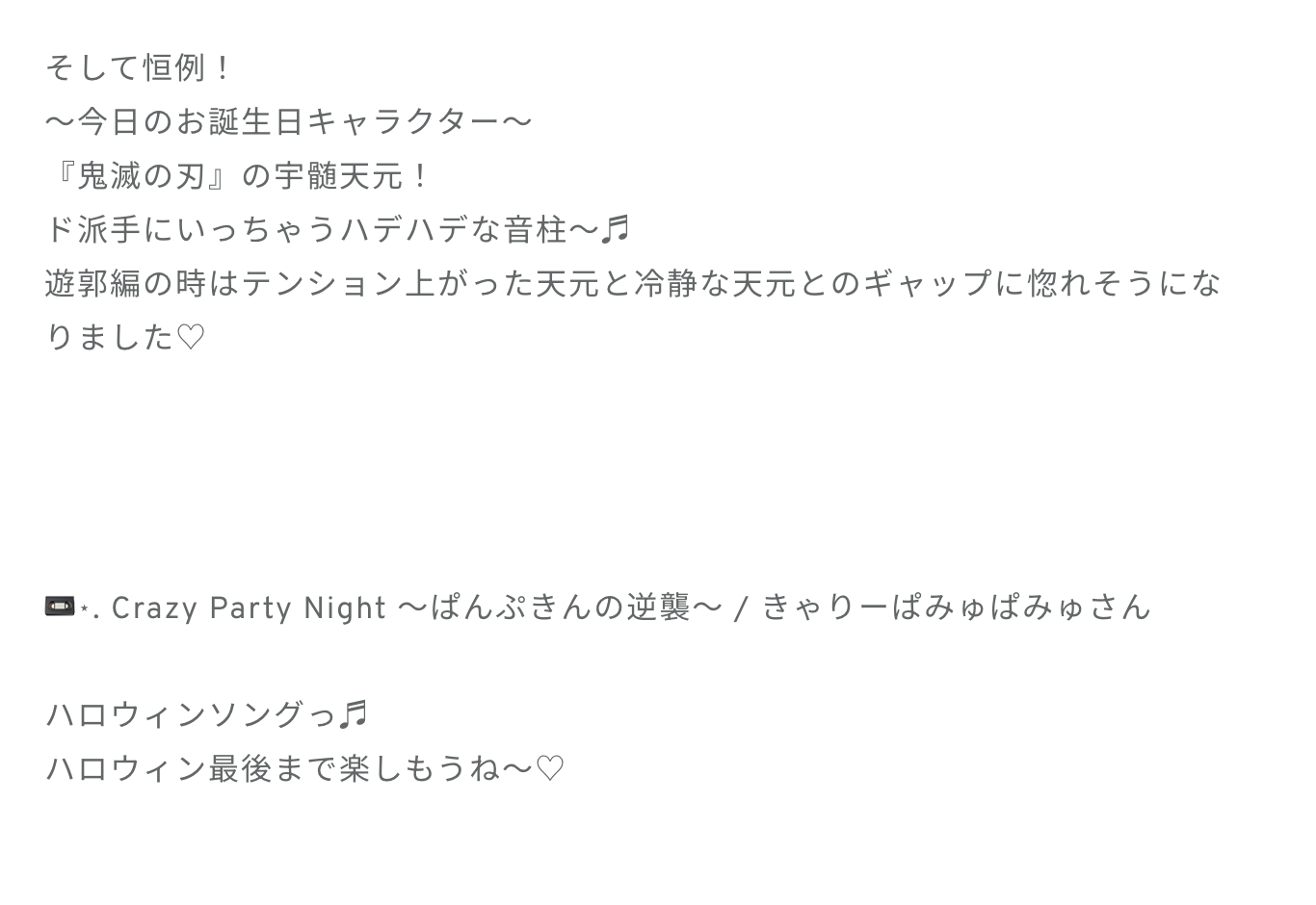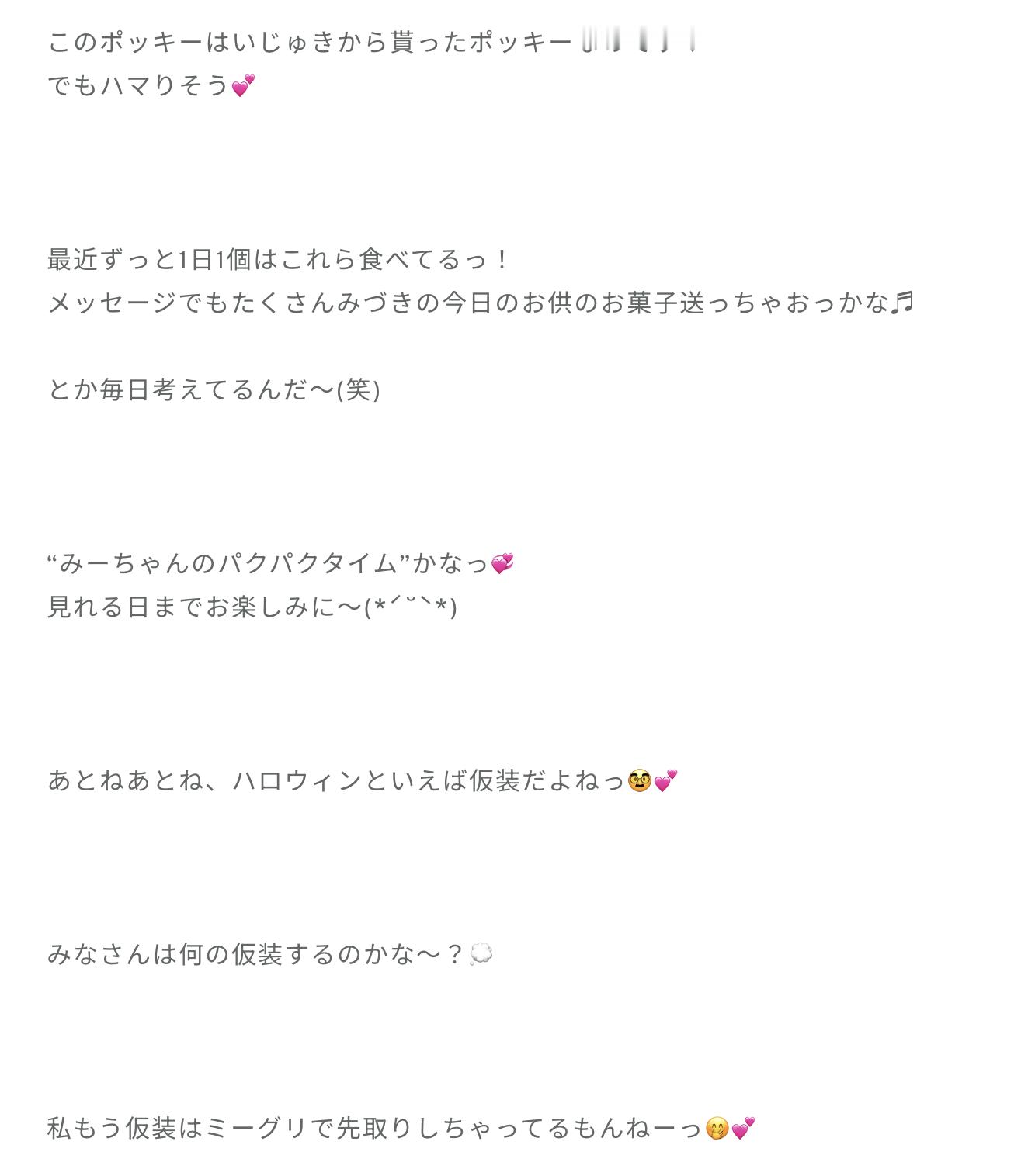 大田美月「10月31日はハロウィンっ!私ね、ほんっとうにお菓子大好き人間だから、毎日毎日お菓子食べてるんだけど…みなさんはみづきになんのお菓子くれるの〜?お菓子くれなきゃいたずらしちゃうぞっ♡ほんとにしちゃうぞ〜っ?( *¯ ꒳¯*)みづきはいたずらされたくないから、みなさんにお菓子プレゼントするねっ♬」
