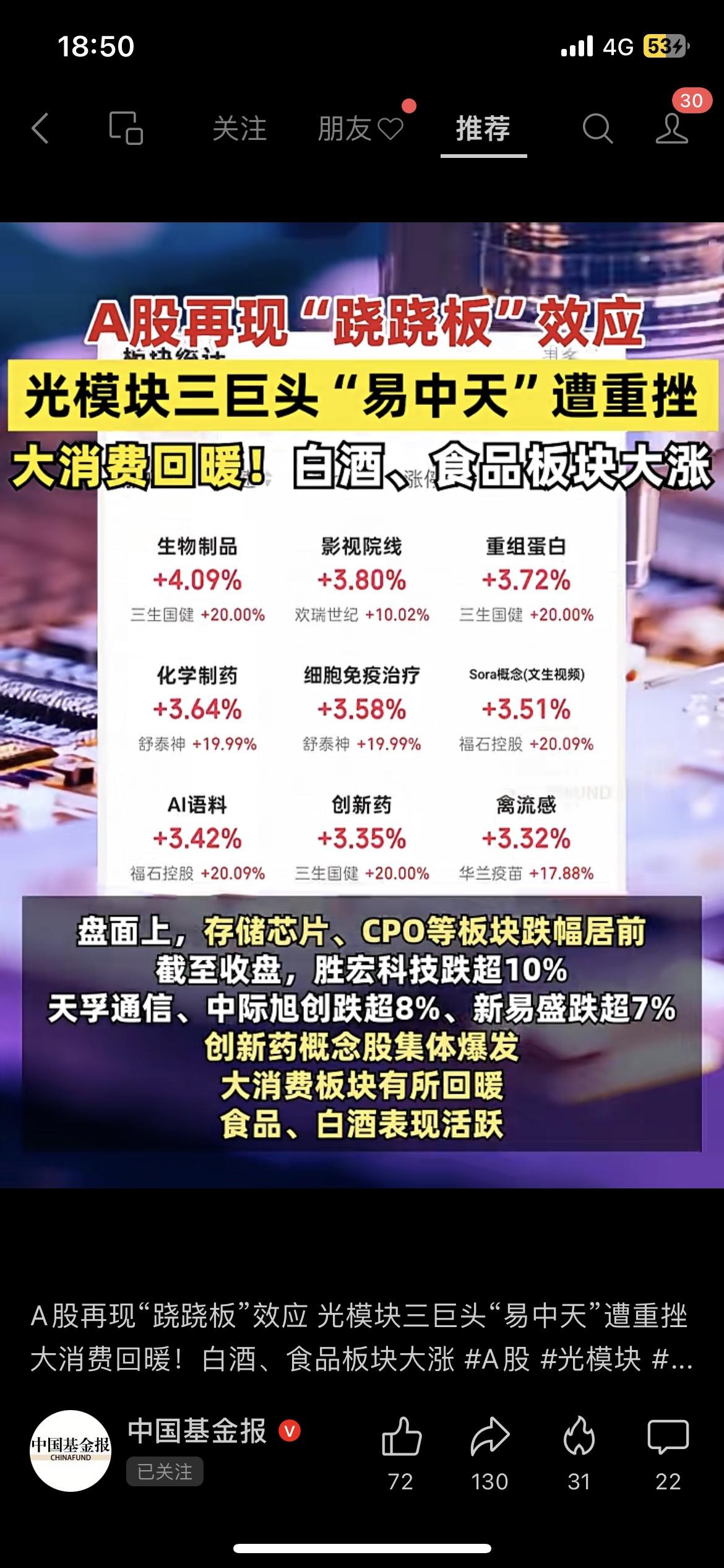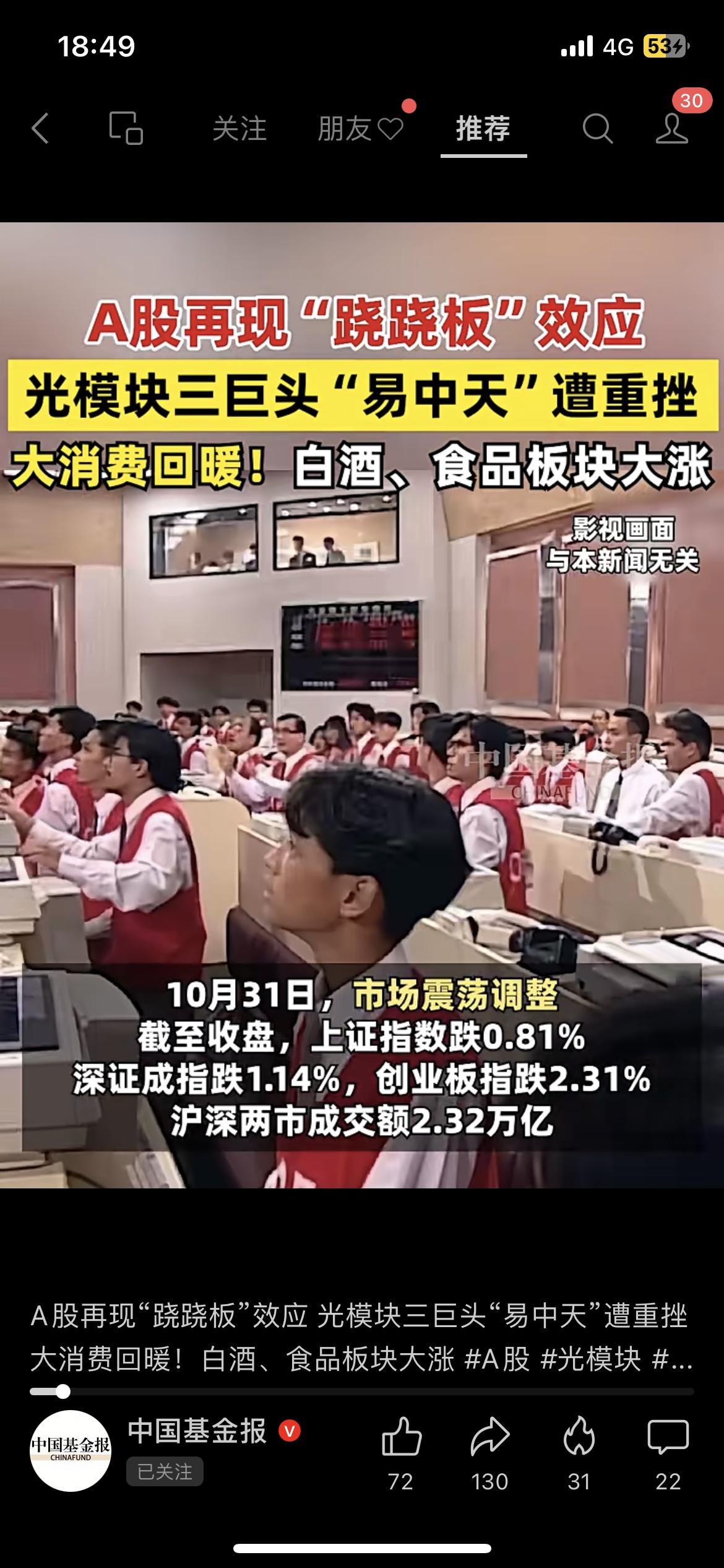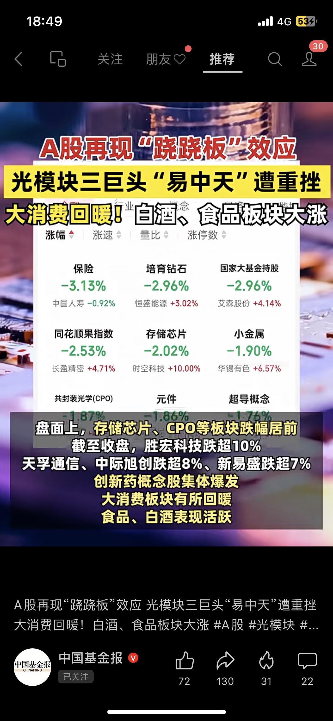 A股疯了!光模块暴跌10%,白酒涨疯! 今天A股直接杀疯!光模块三巨头“易中天”狂跌,胜宏科技跌超10%;白酒、食品却集体涨上天。 有人刚追高光模块,半天亏了半年工资;有人躺平拿白酒,赚够了下个月房贷——这行情谁能摸透? 你今天是亏麻了还是赚嗨了? 持仓科技股的现在就去看账户!别等亏到裤衩子都没了!