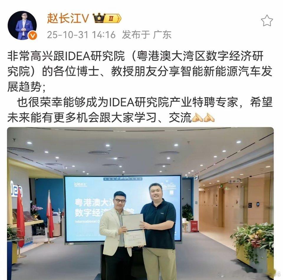根据赵长江发布最新消息显示,他现在已成为IDEA研究院产业特聘专家。