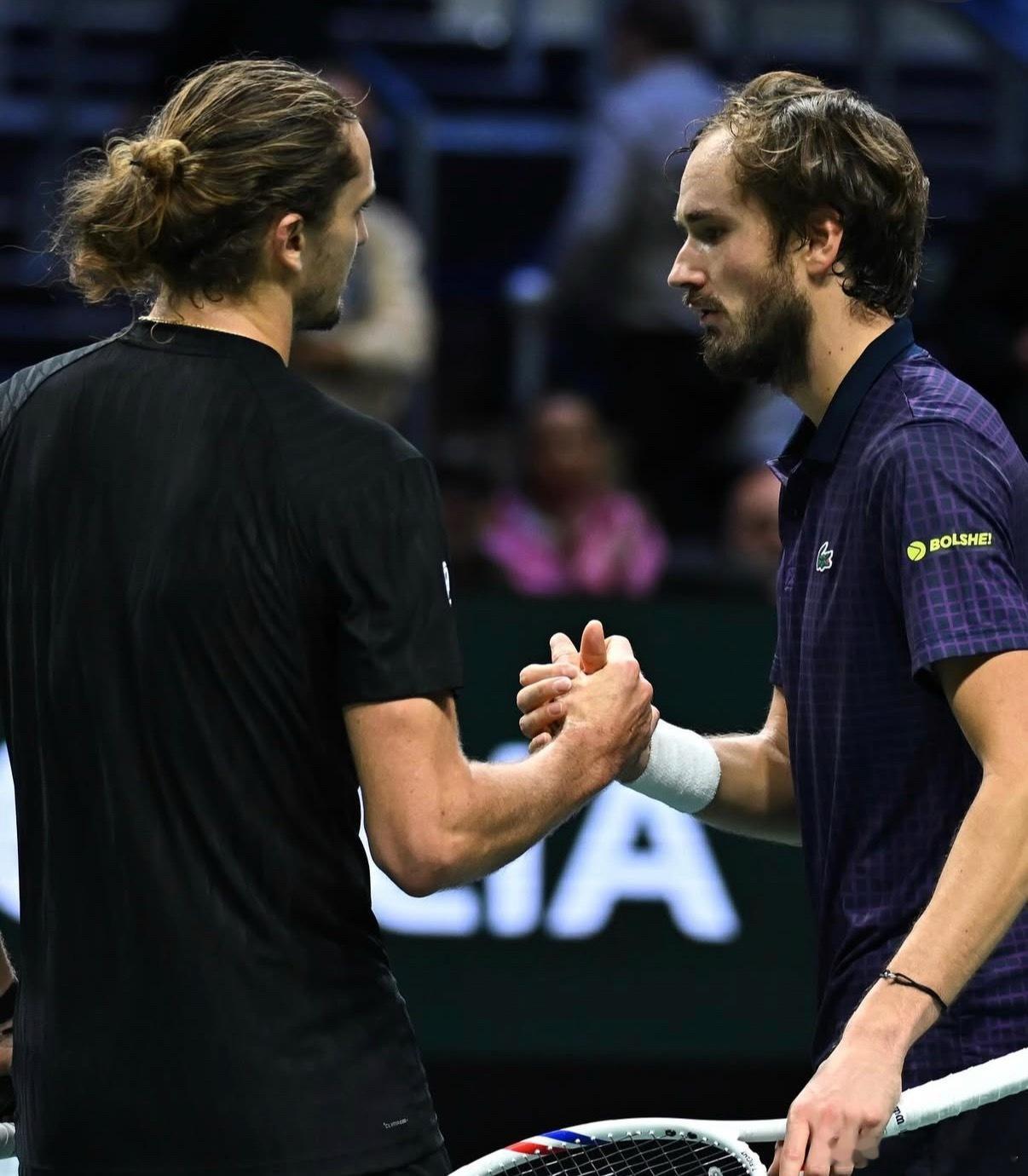ATP1000 巴黎大师赛1/4决赛前赛会冠军之争,兹维列夫在决胜盘化解两个赛点,以2-6 6-3 7-6(5)险胜老对手梅德维德夫,终结对其5连败,艰难闯入四强将战2号种子辛纳。