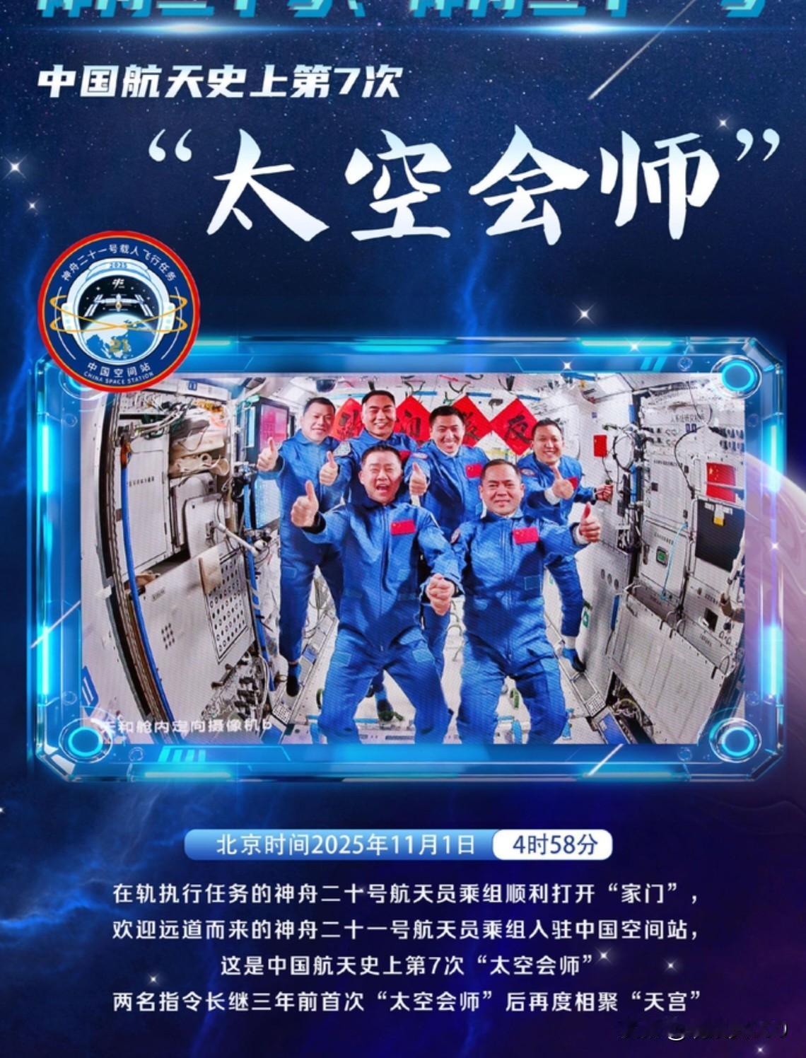天宫全家福上新!太空接力见证中国航天硬核浪漫 这一刻,太空再次迎来中国身影!神舟二十一号与二十号乘组在苍穹之上完成历史性交接,第七次“太空会师”圆满成功。这不仅是航天员的接力,更是中国航天人梦想的接力。 从神舟五号首次飞天到如今常态化驻留,每一次点火都是民族复兴的推力,每一次对接都在太空刻下中国坐标。中国航天用三十载跨越式发展,将千年问天梦化作空间站里闪耀的星辰。 这艘太空中最亮的“中国宫”,正以每90分钟绕地球一圈的速度,向世界展示着东方智慧。为中国航天喝彩,期待神舟家族带来更多宇宙级惊喜!