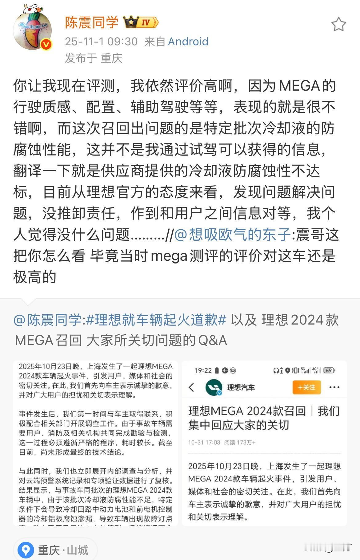 陈震力挺理想! 就在刚才,有个朋友问陈震,理想出了这个事情之后,他是怎么看的? 因为当初陈震在测评理想汽车的时候评价是比较高的,但是现在他们的电池出现了这种问题,是否会改变他的理想这个品牌的形象? 陈震表示:即便是现在理想,让他做测评,他这个评价和以前一样! 因为在他看来,这个MEGA的行驶质感、配置、辅助驾驶等等,表现的就是很不错,而这次召回出问题的是,特定批次冷却液的防腐蚀性能! 这种事情,在他以前测试的时候,是不能够获得这种比较底层专业的信息的,同时他也把这个事情的背后逻辑给翻出来了! 那就是理想之所以要召回这个,是因为供应商提供的冷却液防腐蚀性不达标,而且目前从理想官方的态度来看,当他们发现问题,能够及时的解决问题,没推卸责任,作到和用户之间信息对等,所以他个人觉得,这个事情自始至终到现在,理想的反应和操作都没什么问题。