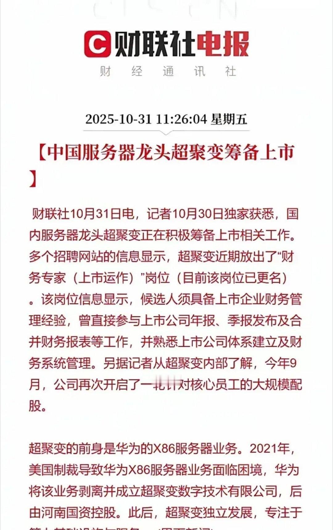 国内服务器龙头超聚变正积极筹备上市,其前身为华为X86服务器业务,因美国icon制裁剥离后由河南国资控股,聚焦算力基础设施与服务领域。通过招聘上市财务岗位、核心员工配股等动作,上市进程加速,有望带动服务器产业链、算力基建及华为生态相关板块发展。